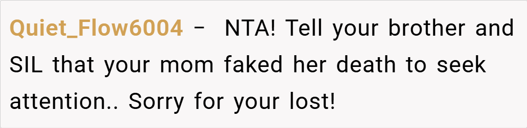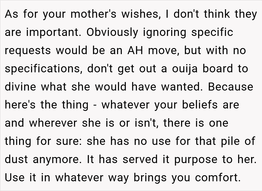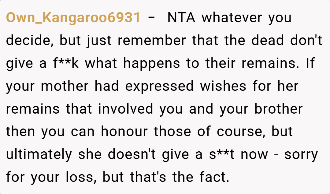 “NTA. Family respect is earned, and if he couldn’t show up when it mattered most, he has no claim over her remains.” “While your pain is understandable, some think you should consider what your mom would have wanted. But if she never left explicit instructions, your feelings are valid.”