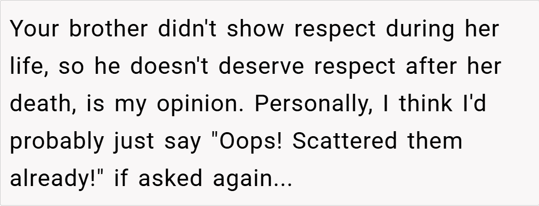 In conclusion, this story delves deep into the heartache of loss and the complexities of familial responsibility. The storyteller’s refusal to share their mother’s ashes with a brother who failed to honor her in life is a raw expression of betrayal and grief. While some may view the reaction as overly harsh, others understand it as a justified response to profound neglect.