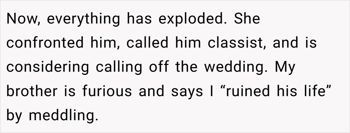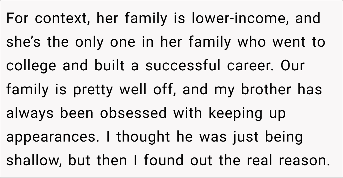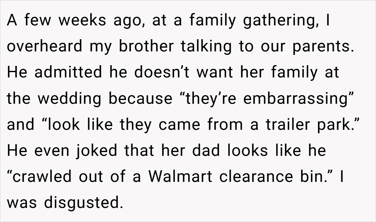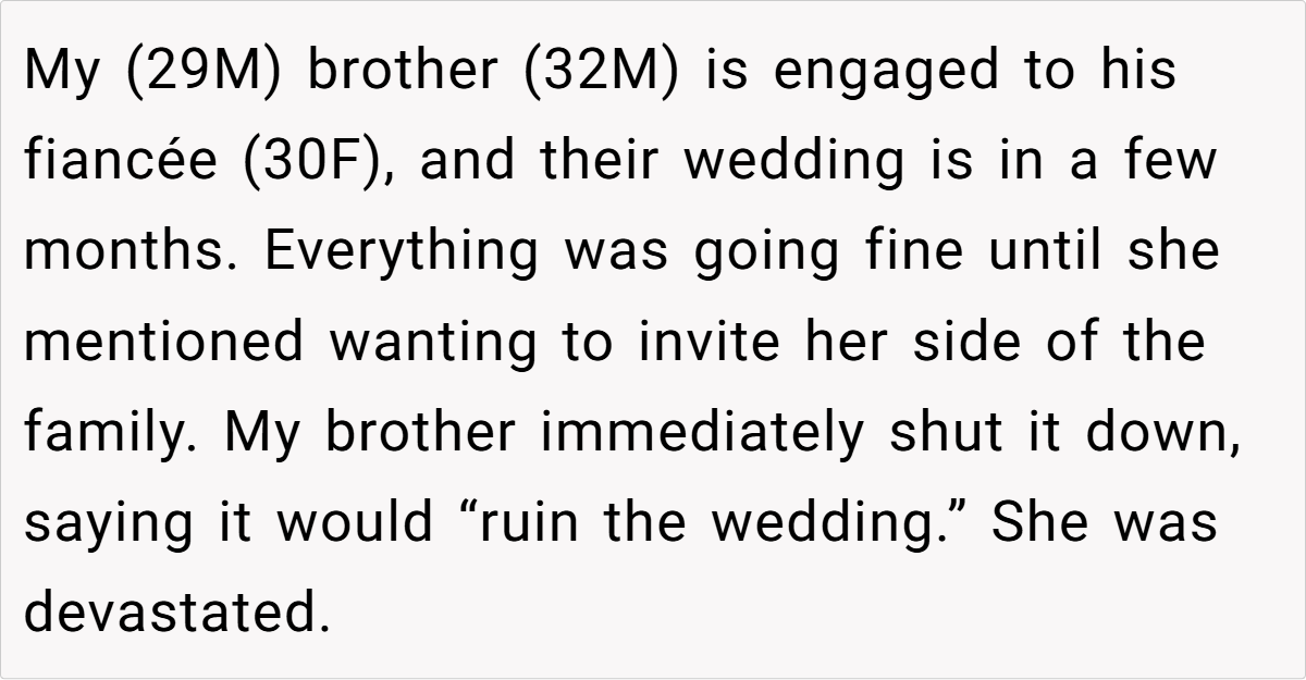 OP’s (29M) brother (32M) is engaged, and everything was fine until his fiancée (30F) mentioned inviting her family. His brother immediately refused, which devastated her. At first, OP assumed it was just about keeping up appearances, but later he overheard his brother making cruel remarks about her family, calling them “embarrassing” and even mocking her father.