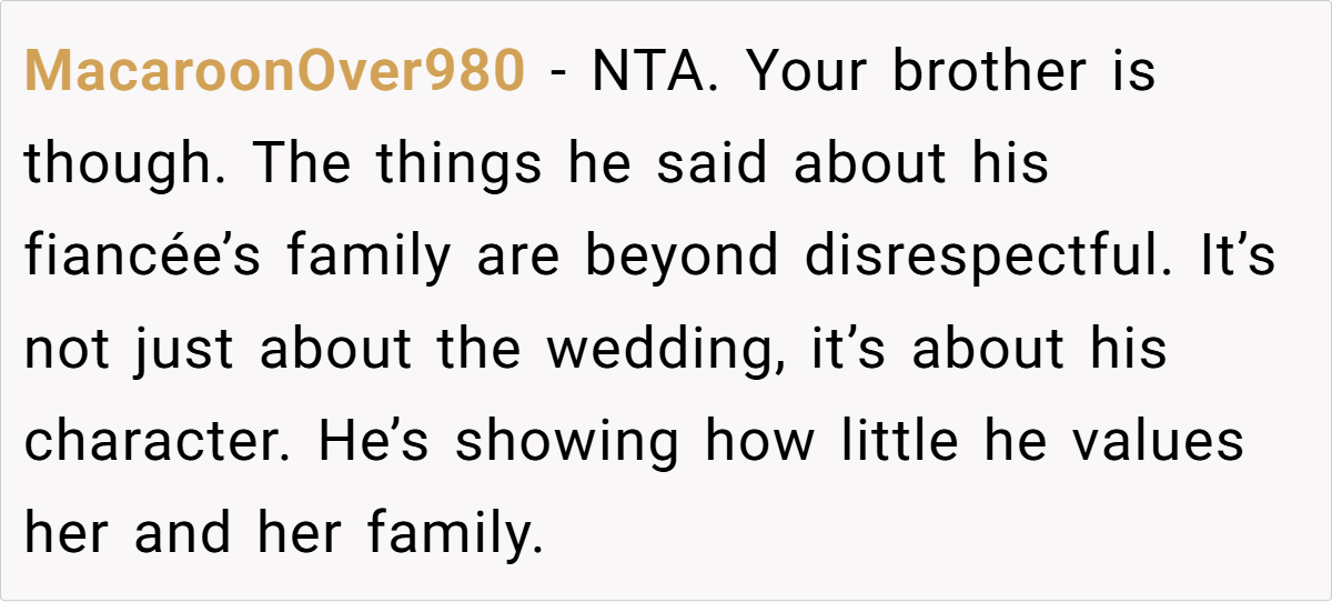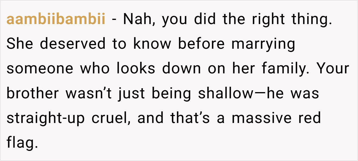 Many pointed out that if the brother was willing to demean her family now, it was a sign of how he might treat her in the long run. Some even suggested that OP’s actions saved her from a potentially toxic marriage.