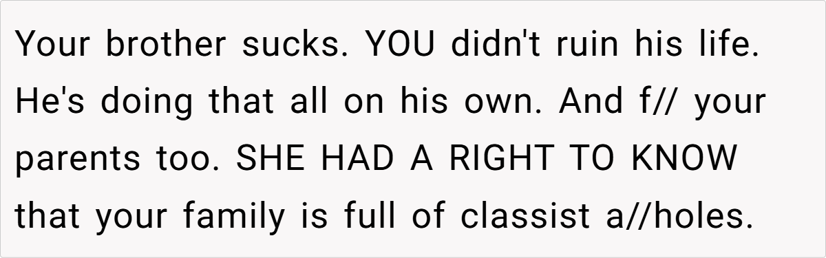 The brother’s comments don’t just indicate a lack of respect for her family; they reveal a deeper issue of how he perceives his fiancée’s worth. When individuals in relationships feel ashamed of their partner’s family, it often creates resentment and insecurity.
