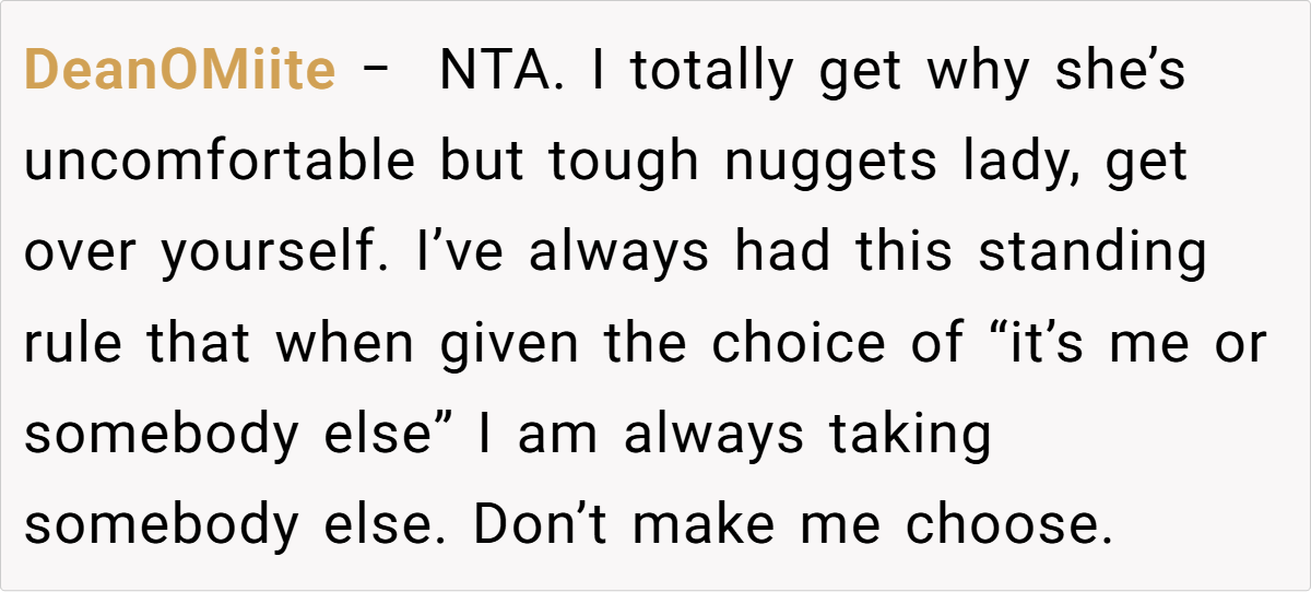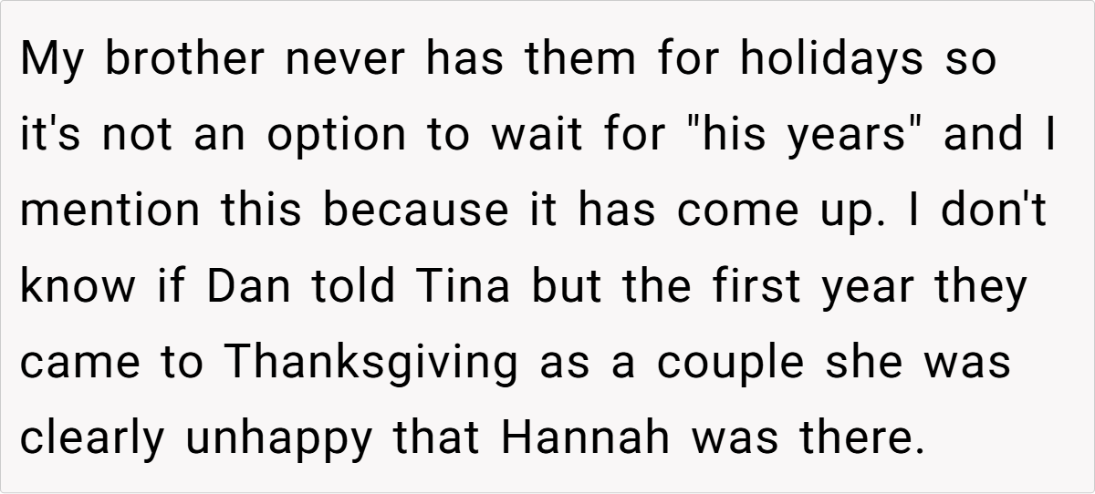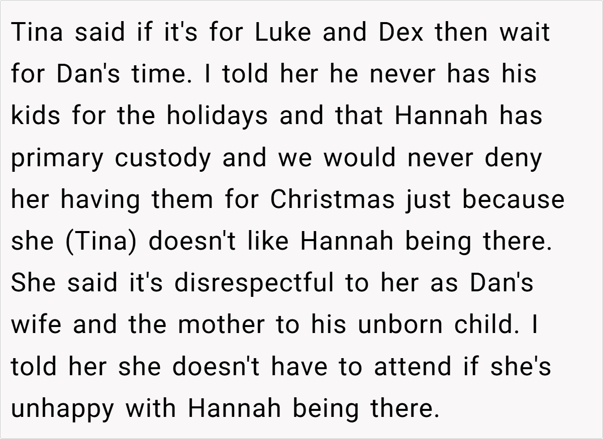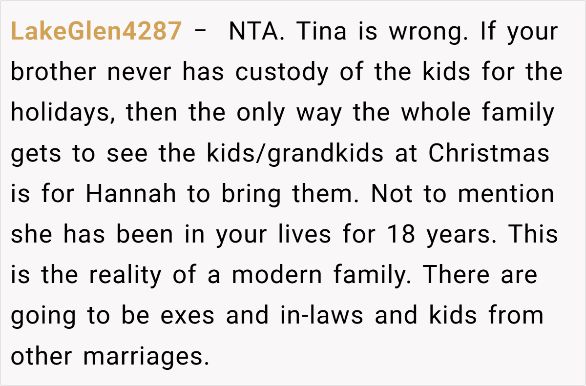 Redditors overwhelmingly sided with the OP, praising her for prioritizing the children and Hannah’s 18-year bond with the family. Top comments called Tina “insecure” and Dan a “deadbeat dad,” noting his lack of holiday custody. Others warned that Tina’s demands could escalate, especially with a new baby on the way: “She’ll weaponize that child to erase Hannah and your nephews next.”
