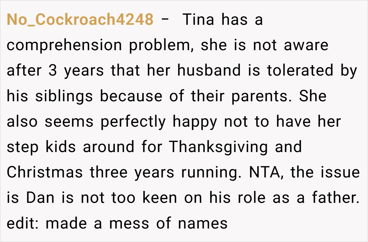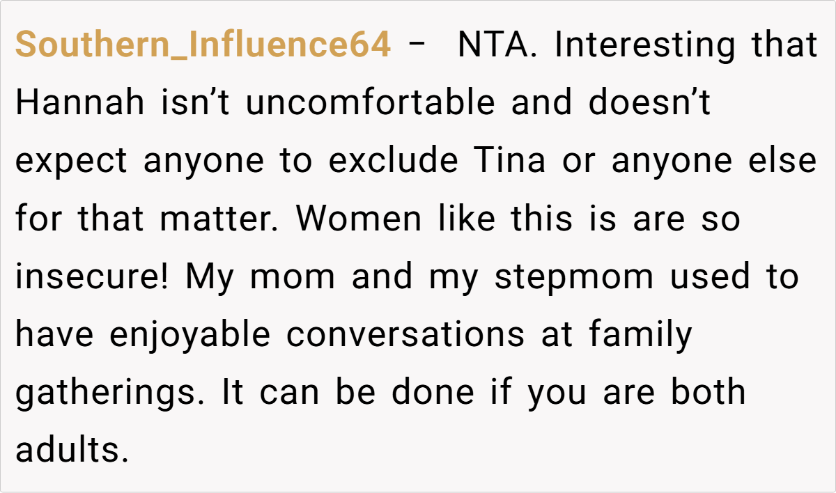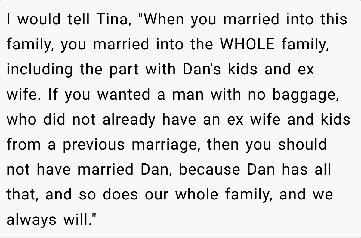 A minority critiqued the OP’s blunt delivery but agreed with her stance. As one user wrote, “Tina married into a package deal. If she wanted no exes, she shouldn’t have married a divorced dad.”