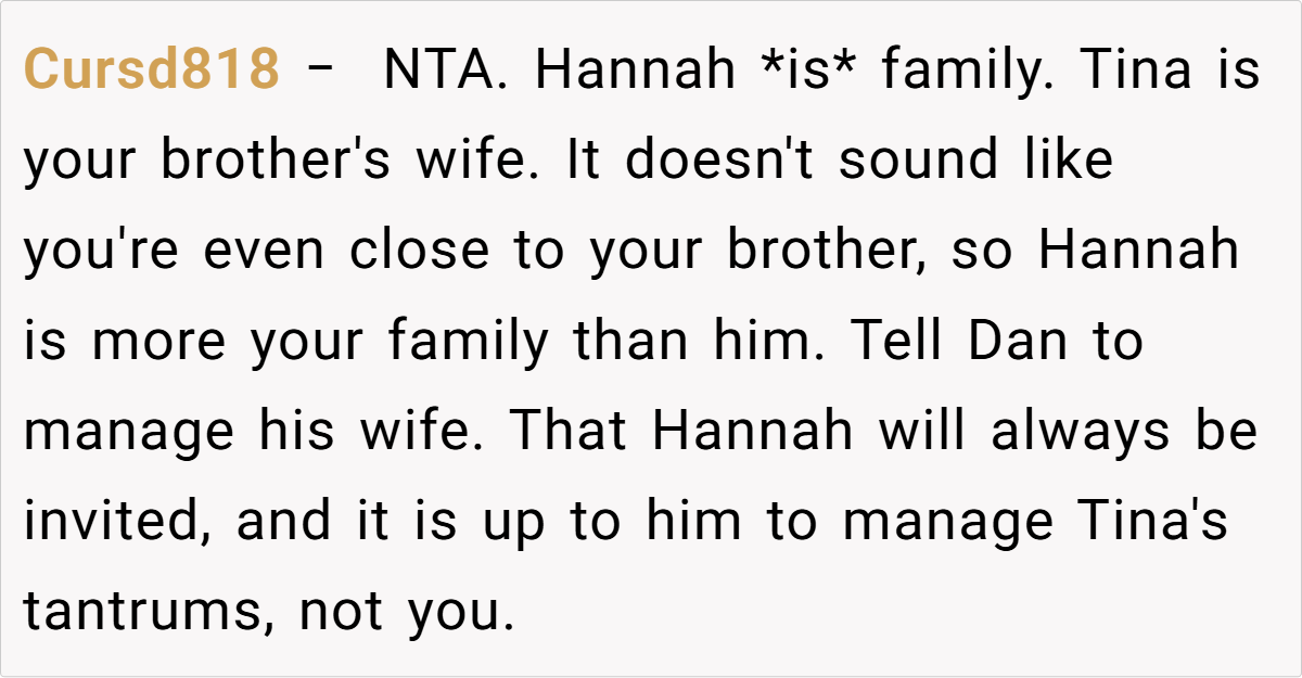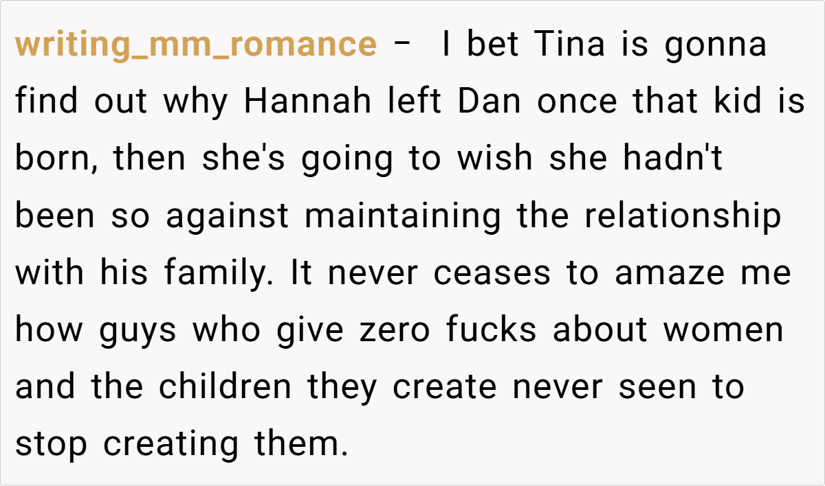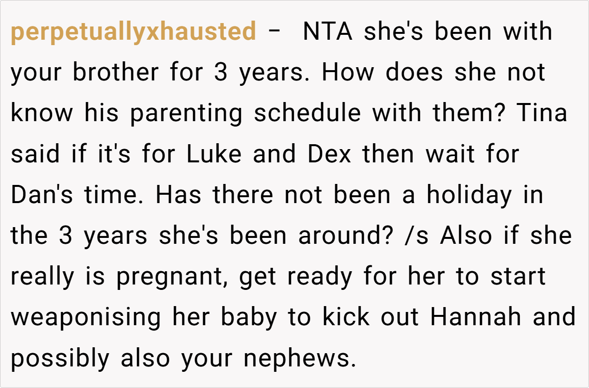 As Redditors warned, “Tina’s about to learn why Hannah left Dan.” Until then, the OP’s loyalty to her nephews—and the family’s history—deserves protection.