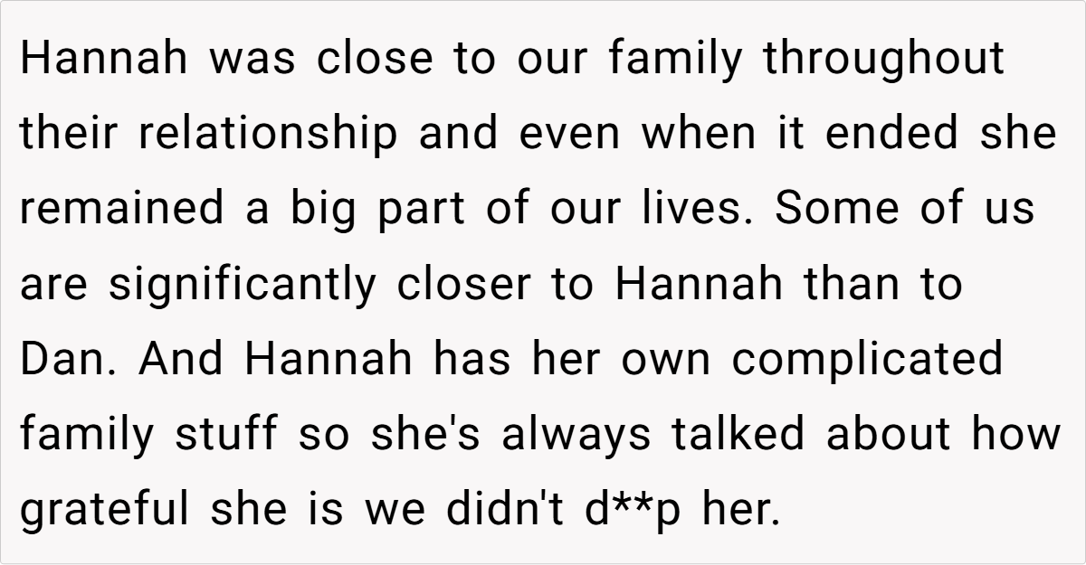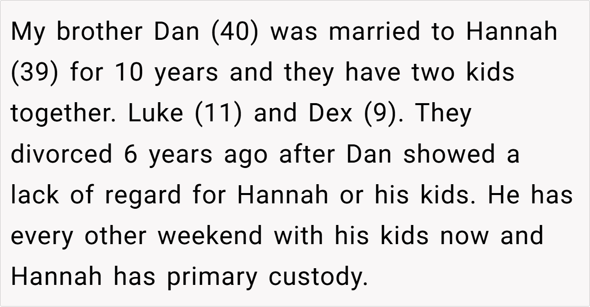 Hannah, despite divorcing the OP’s brother Dan six years ago, remains integral to the family due to her role as the primary caregiver to their grandchildren. Tina, however, views Hannah’s presence as a threat, sparking a debate about respect, boundaries, and what it means to be “family.”
