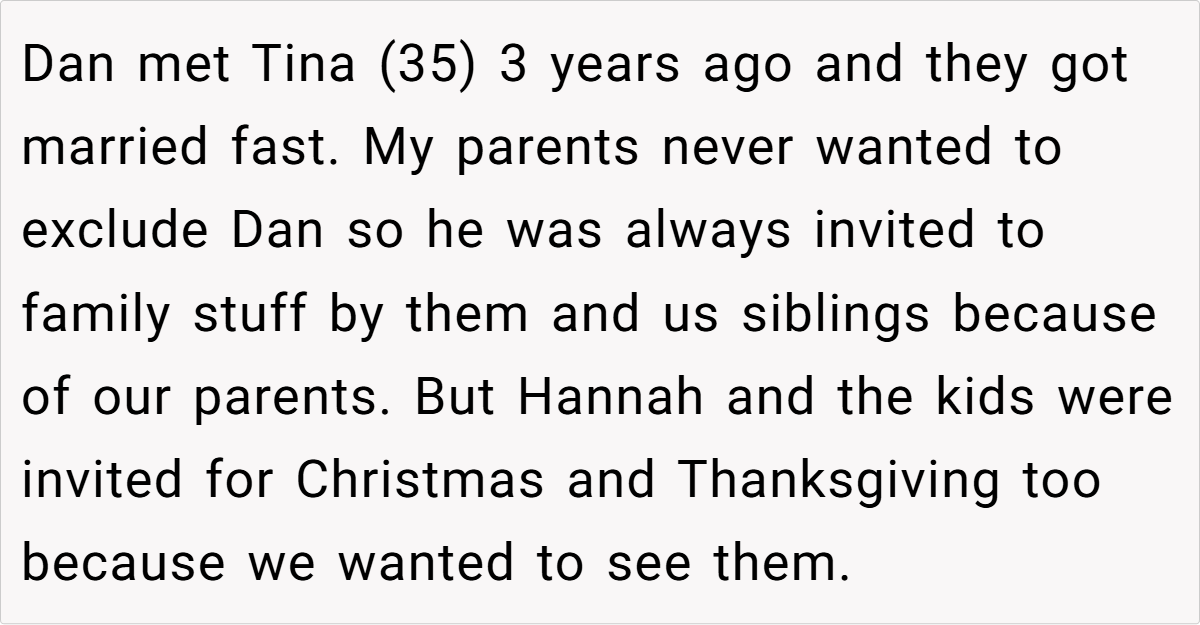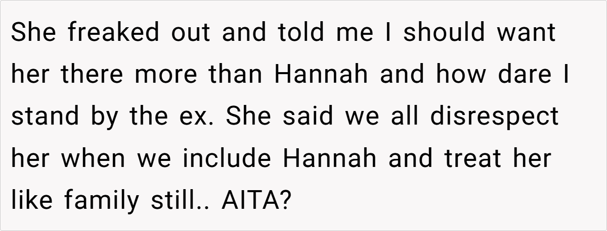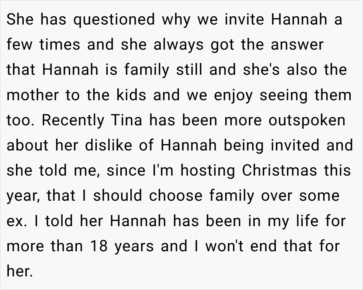 Family holidays often test the limits of blended relationships, but few conflicts are as charged as a new spouse demanding the exclusion of a beloved ex. In this Reddit post, the OP faces backlash from her brother’s wife, Tina, for inviting his ex-wife, Hannah—the mother of his children—to family gatherings. The clash reveals tensions between loyalty to long-standing family bonds and the insecurities of a new partner, all while prioritizing the children’s connection to their extended family.