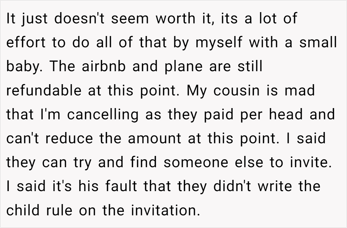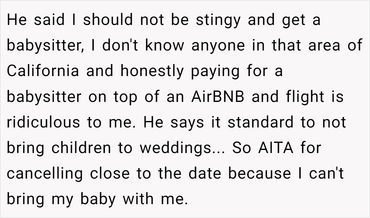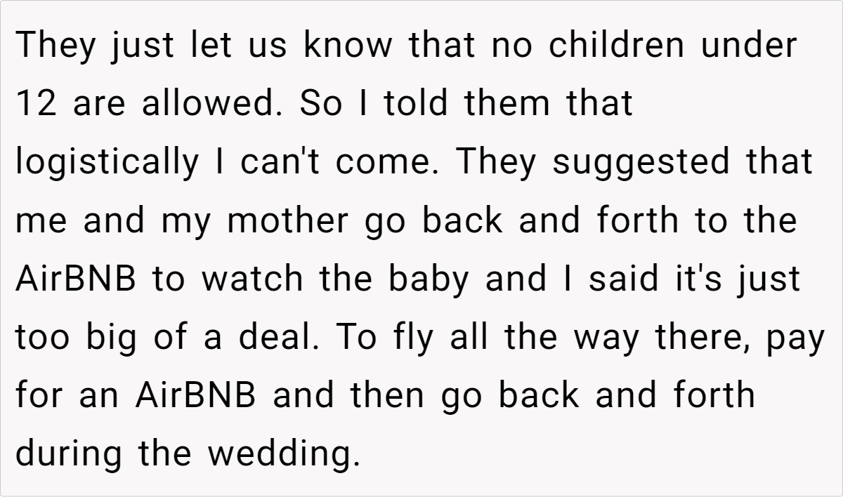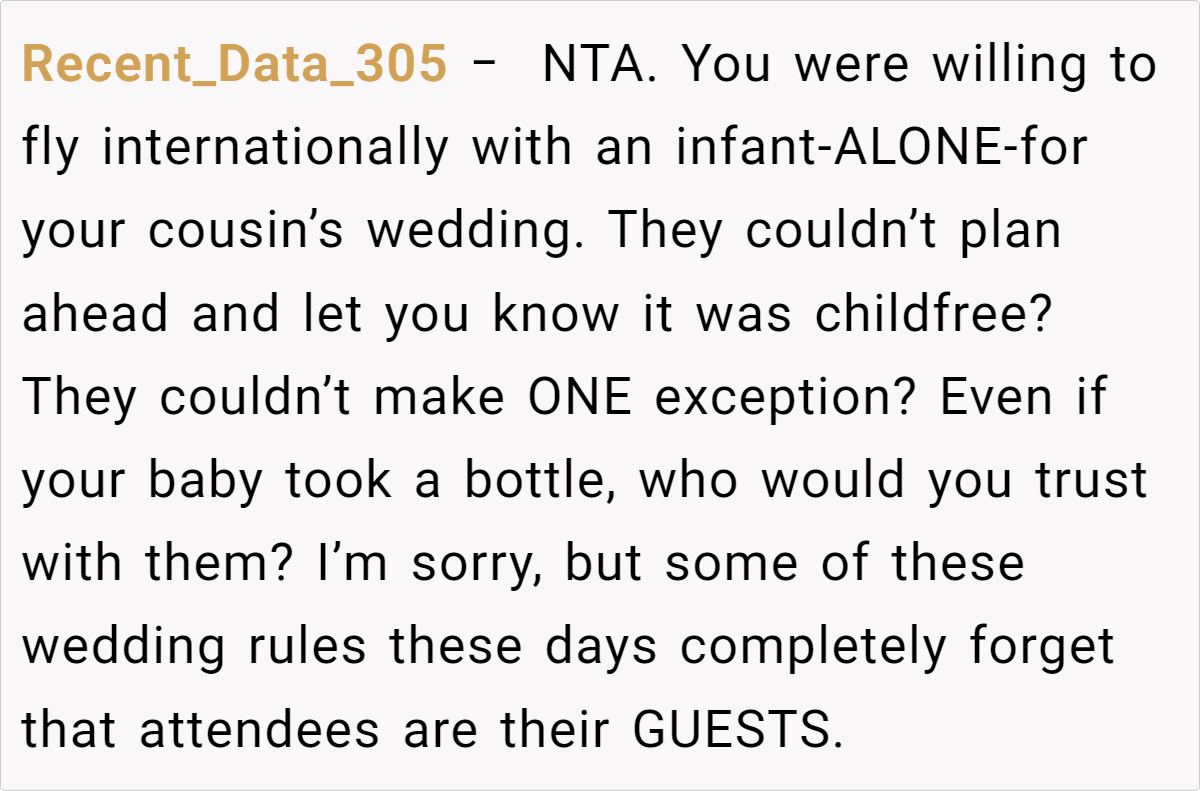 Letting a wedding’s strict policies dictate a parent’s ability to attend can feel deeply unfair. In this case, the cousin’s decision to enforce a no-child rule clashes with the realities of parenting an infant. The post details a scenario where a mother, already facing the challenges of caring for a four‐month‐old baby while traveling internationally, finds herself forced to choose between family obligations and her child’s well-being. This conflict highlights how inflexible event policies can create undue pressure on parents, making participation nearly impossible.