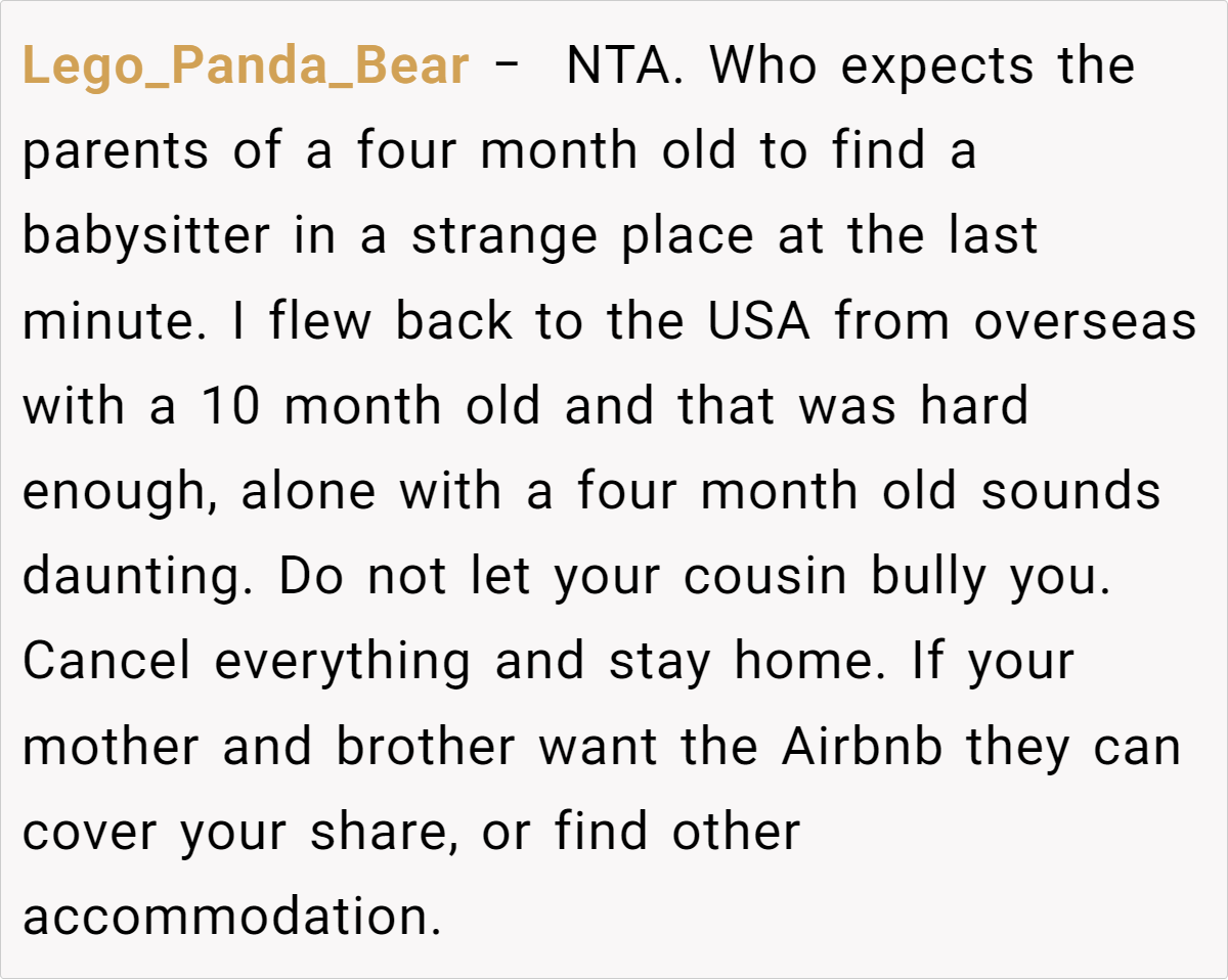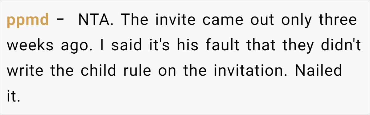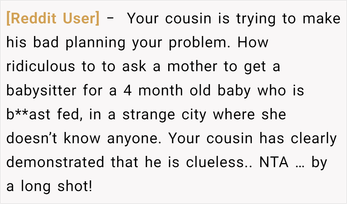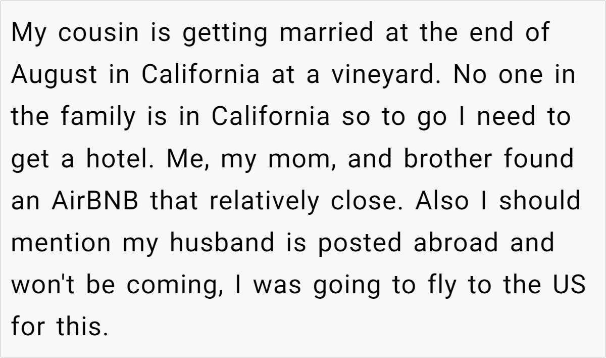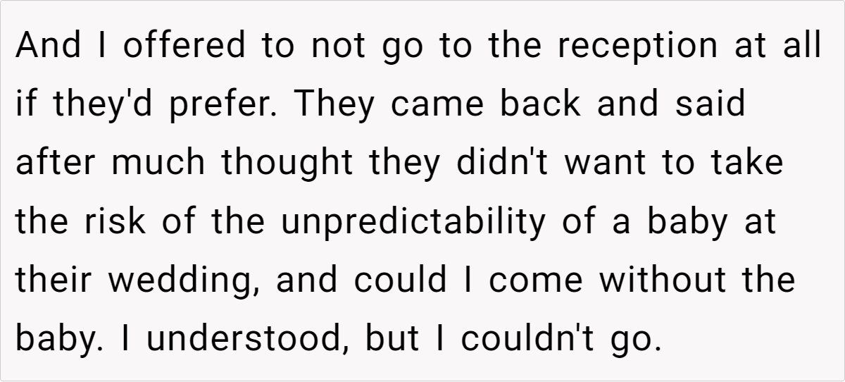 Letting a wedding’s strict policies dictate a parent’s ability to attend can feel deeply unfair. In this case, the cousin’s decision to enforce a no-child rule clashes with the realities of parenting an infant. The post details a scenario where a mother, already facing the challenges of caring for a four‐month‐old baby while traveling internationally, finds herself forced to choose between family obligations and her child’s well-being. This conflict highlights how inflexible event policies can create undue pressure on parents, making participation nearly impossible.
