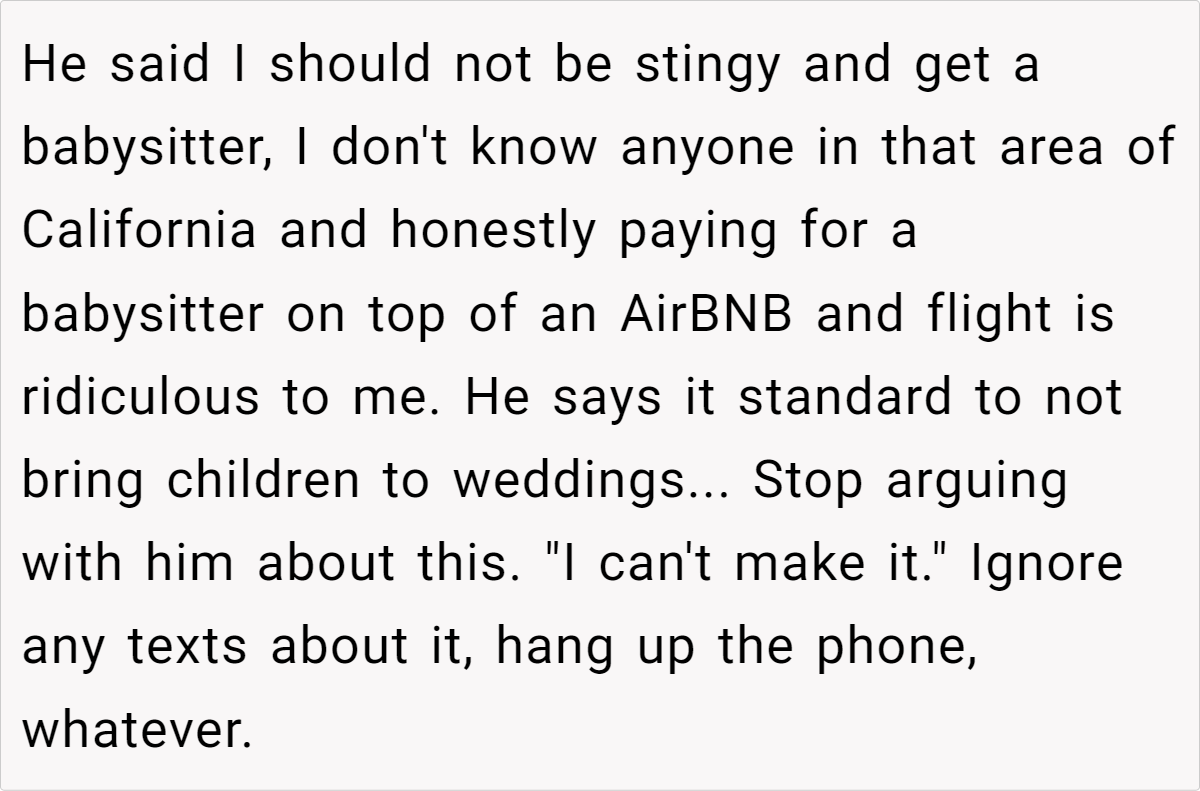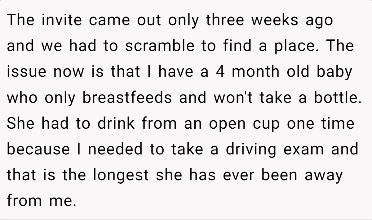 The logistical challenges here are substantial. The invitation was sent just three weeks before the wedding, leaving minimal time to secure proper accommodations and childcare. For a parent with a baby who only breastfeeds and reacts poorly to separation, the prospect of constant back-and-forth travel is daunting. The practical considerations of booking an Airbnb, flying internationally, and arranging unknown babysitters in an unfamiliar city underscore that, for some, attending such an event isn’t just inconvenient—it’s unfeasible.