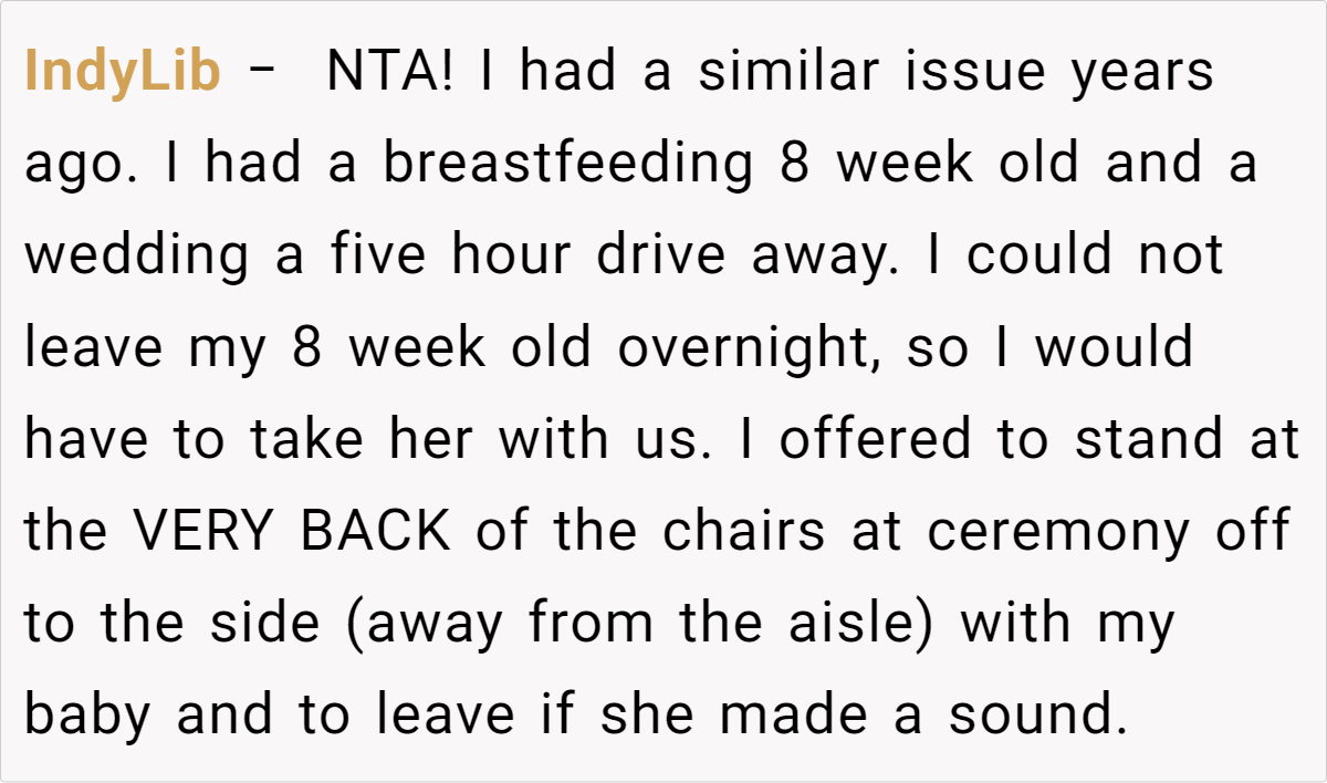 Here are some hot takes from the Reddit community – candid and humorous. The responses range from empathetic support for the challenges of parenting a young infant to sharp critiques of rigid wedding policies.