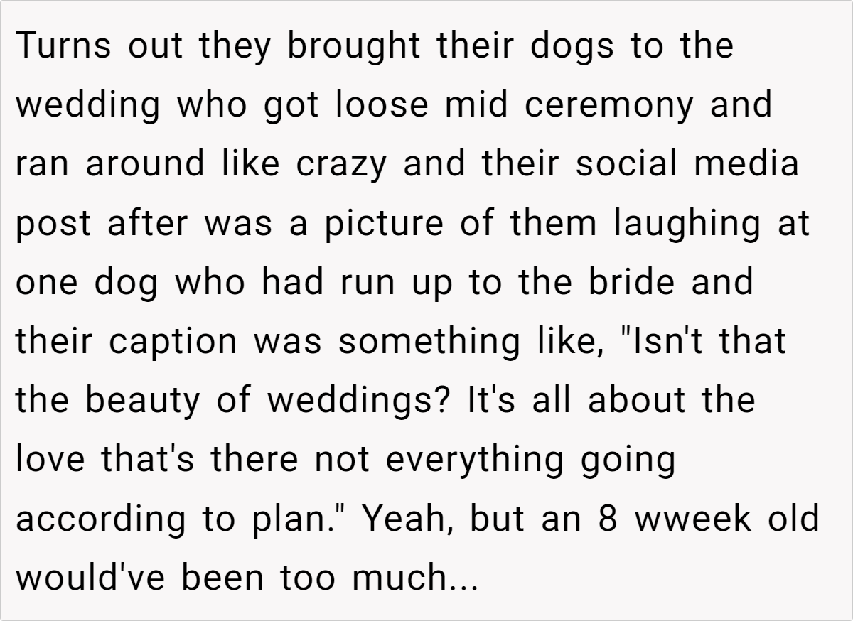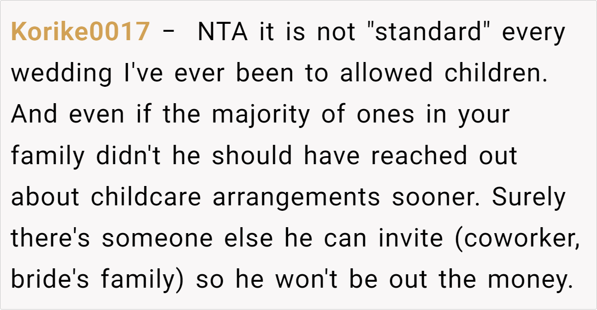 The broader issue here reflects the tension between traditional event planning and the evolving dynamics of modern family life. Many weddings adopt strict policies without considering that not every guest can seamlessly meet these criteria.