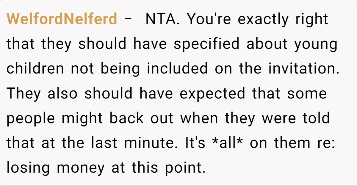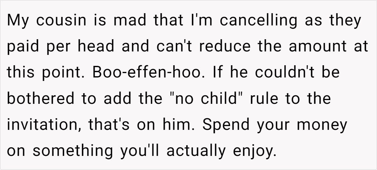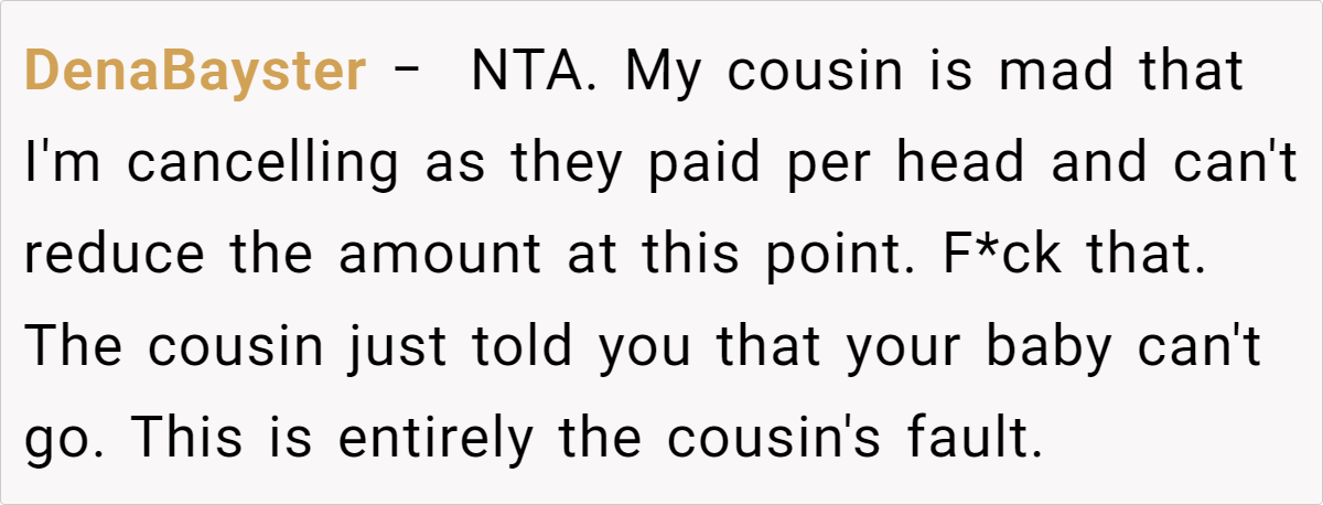 Ultimately, while the cousin’s frustration over lost per-head payments is understandable from a logistical standpoint, the crux of the matter lies in prioritizing the child’s comfort and the parent’s peace of mind. Experts suggest that clear communication and early notice about attendance rules could prevent such conflicts.