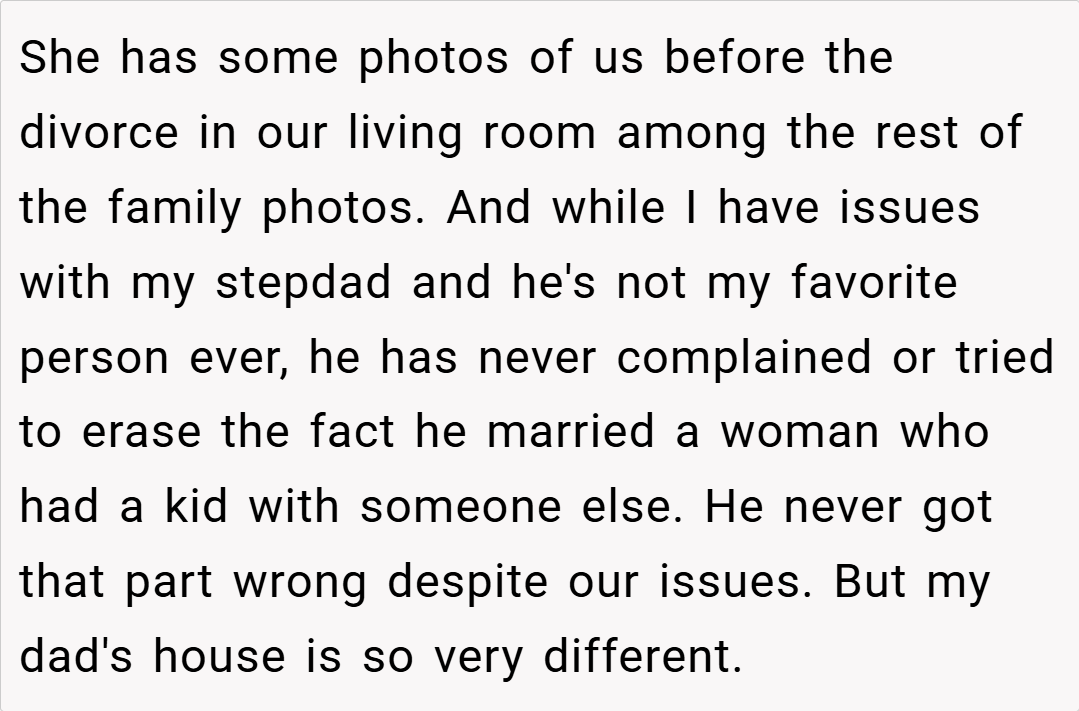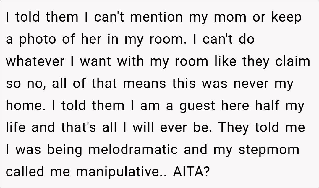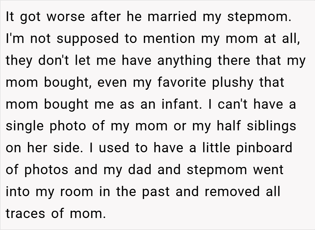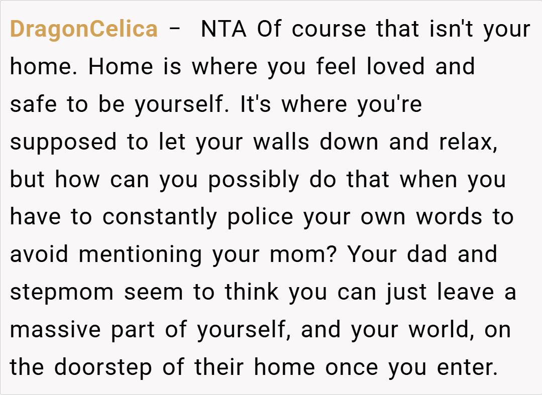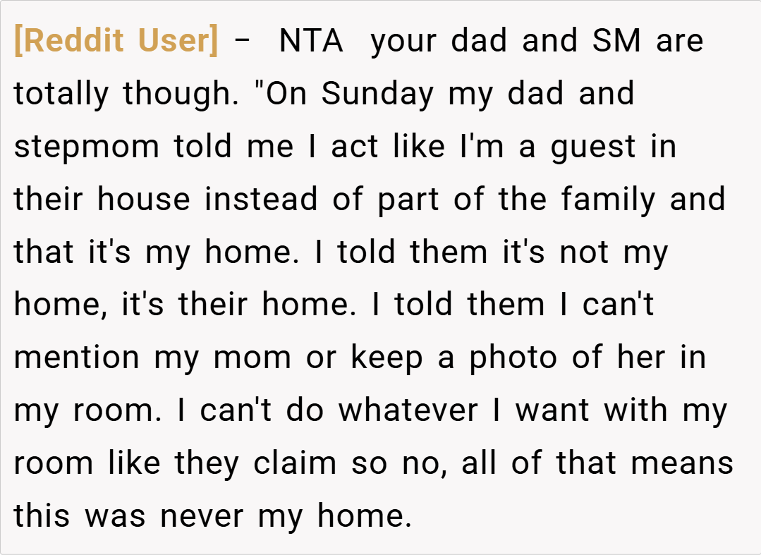 The Reddit community overwhelmingly sided with the teen, condemning the actions of her dad and stepmom. Commenters lamented the erasure of her maternal memories and the unilateral control over her personal space. Many voiced that no child should have to feel like a stranger in their own room, with one user calling the behavior “parental alienation” at its worst. The consensus was clear: her feelings are valid, and her home should reflect her full identity, not just one side of her family.