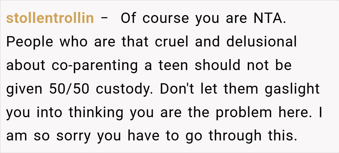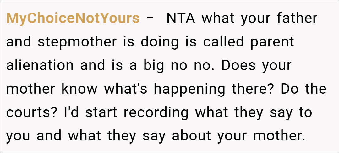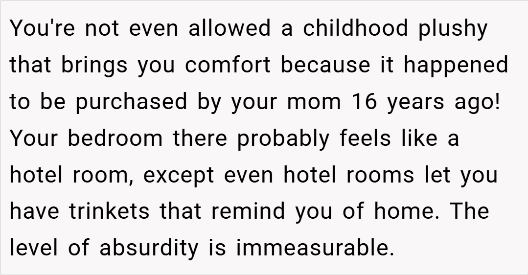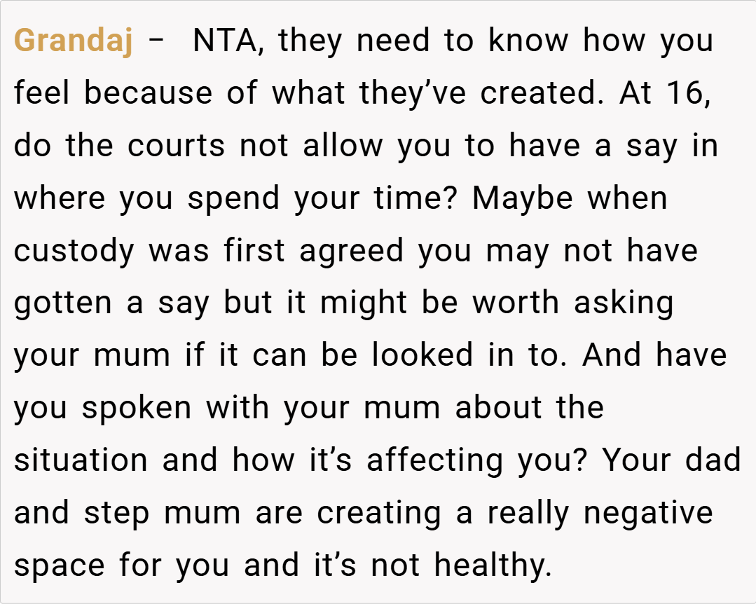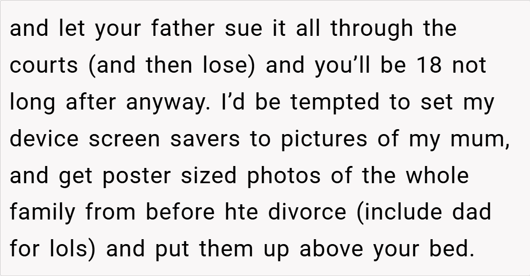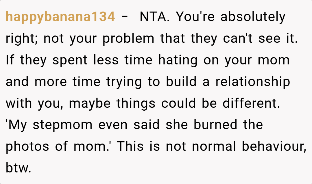 The Reddit community overwhelmingly sided with the teen, condemning the actions of her dad and stepmom. Commenters lamented the erasure of her maternal memories and the unilateral control over her personal space. Many voiced that no child should have to feel like a stranger in their own room, with one user calling the behavior “parental alienation” at its worst. The consensus was clear: her feelings are valid, and her home should reflect her full identity, not just one side of her family.