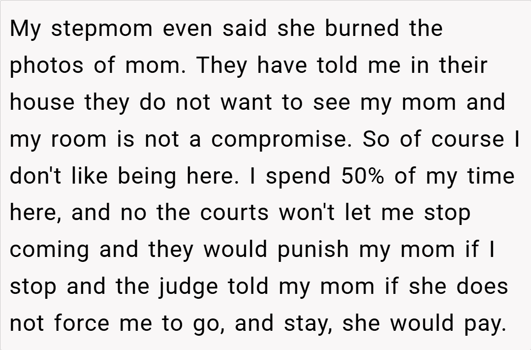 In the midst of a contentious custody arrangement, a 16-year-old found herself at the heart of a painful family struggle. Torn between two worlds, she candidly declared that her dad and stepmom’s house isn’t her home—a space where memories of her mother and half-siblings have been systematically erased.