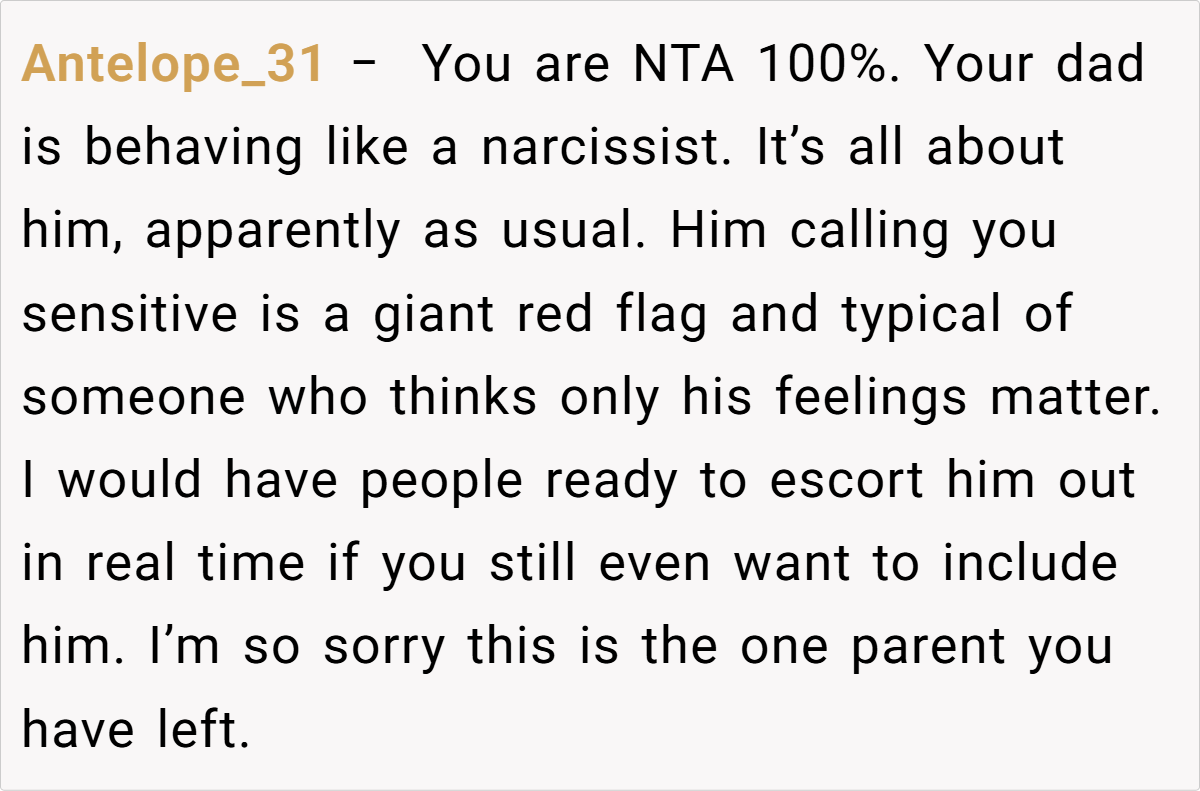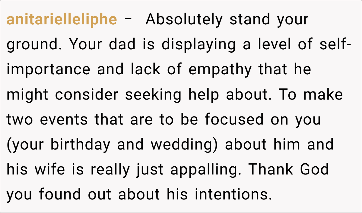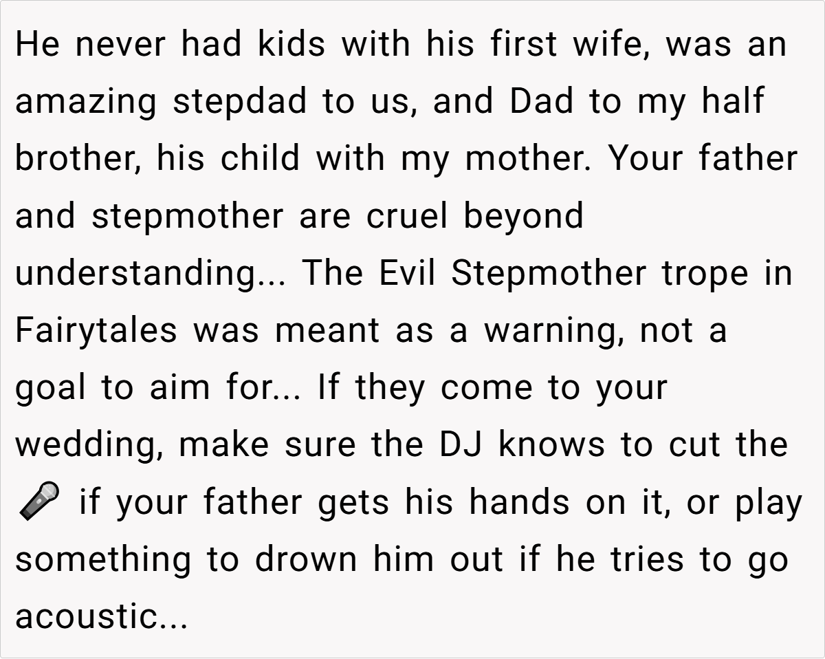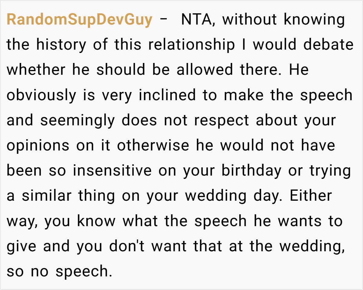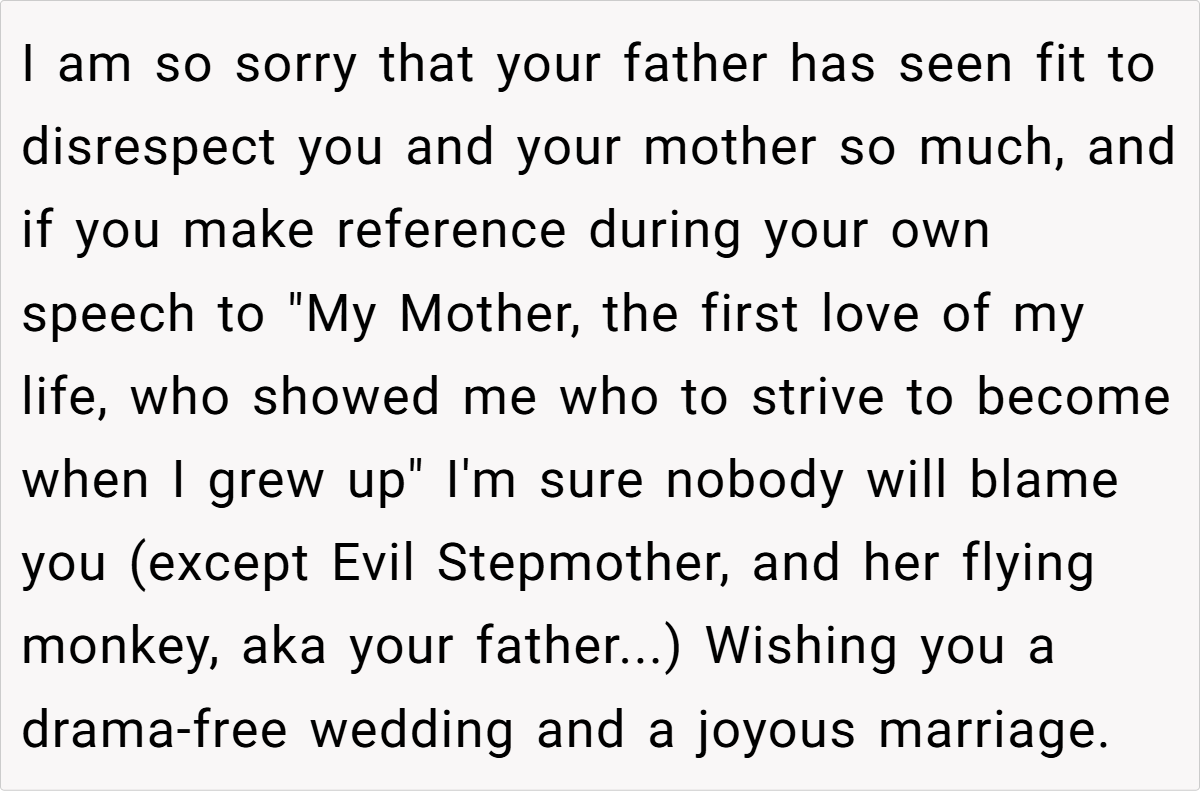 They emphasized that if her father did not comply, OP had every right to refuse to speak at the wedding. Some also criticized her father’s arrogant and unsympathetic attitude, and suggested that OP could consider taking more drastic measures, such as not inviting her father and his wife to the party, if necessary. Overall, the community believes that OP is not a troublemaker but is just defending her rights on an important occasion, and everyone agrees that the wedding should focus on the couple instead of unrelated family conflicts.