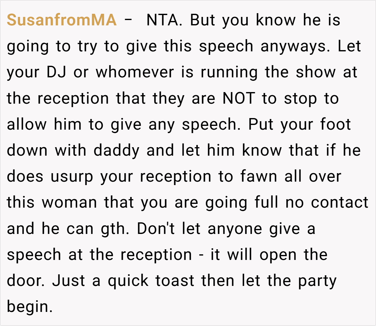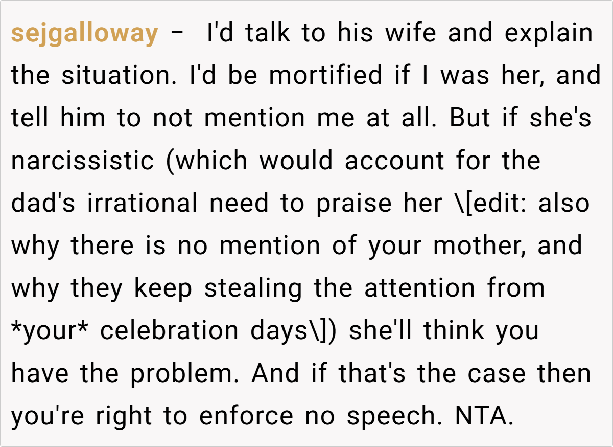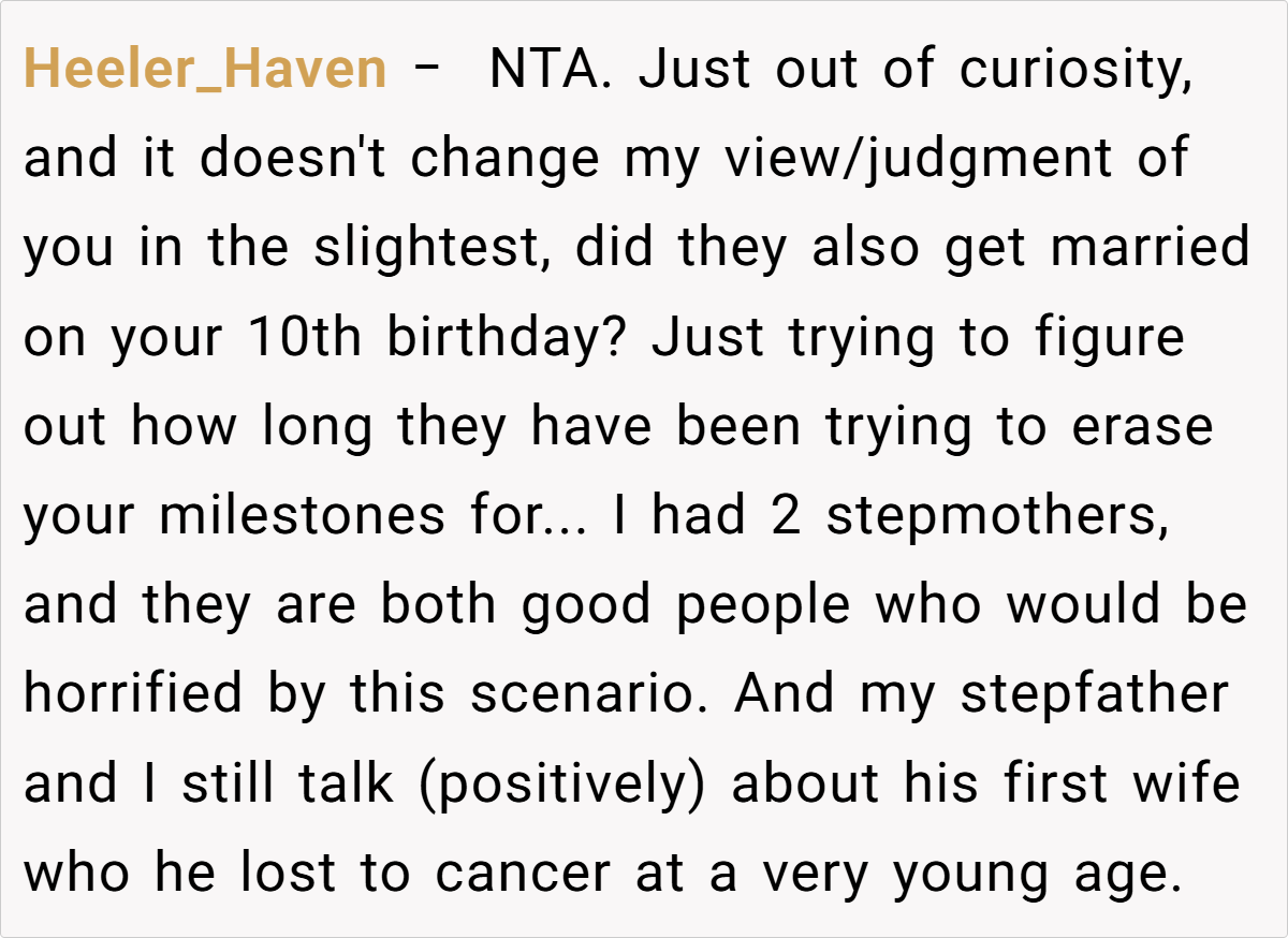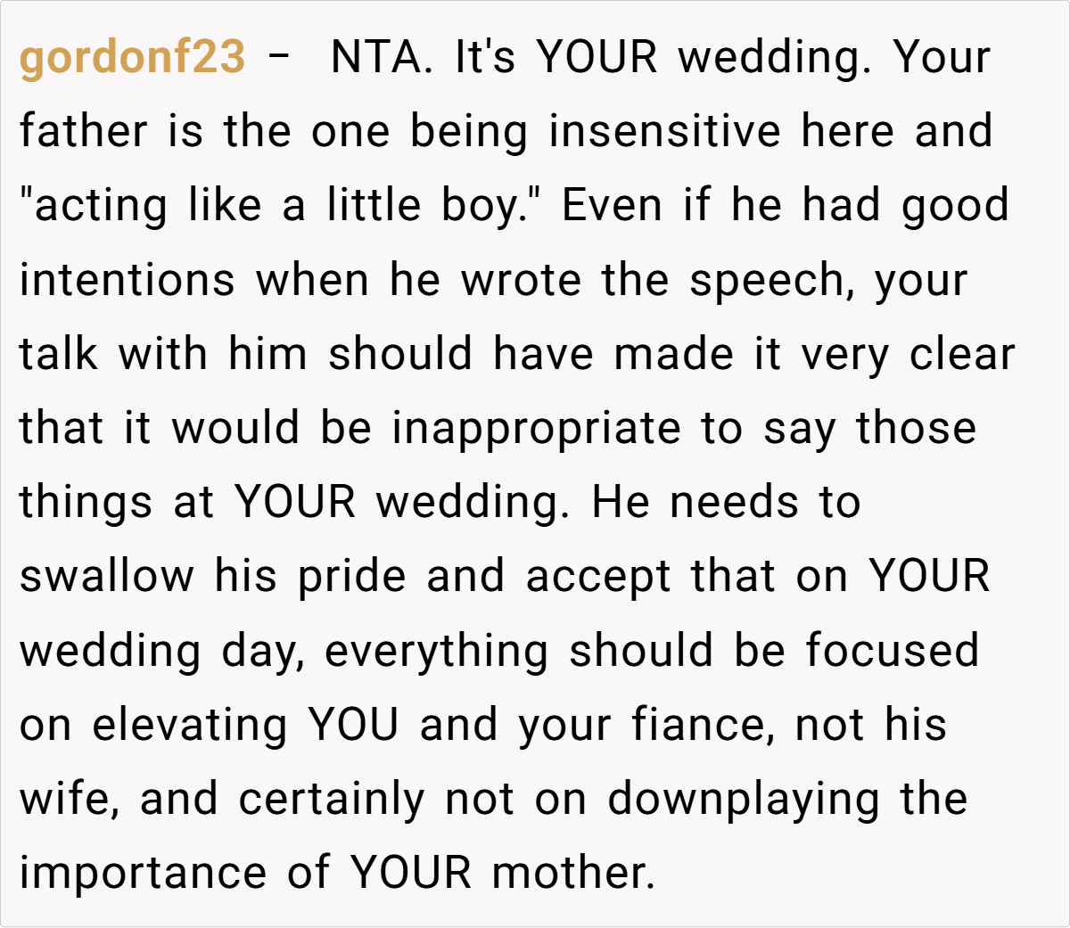 They emphasized that if her father did not comply, OP had every right to refuse to speak at the wedding. Some also criticized her father’s arrogant and unsympathetic attitude, and suggested that OP could consider taking more drastic measures, such as not inviting her father and his wife to the party, if necessary. Overall, the community believes that OP is not a troublemaker but is just defending her rights on an important occasion, and everyone agrees that the wedding should focus on the couple instead of unrelated family conflicts.