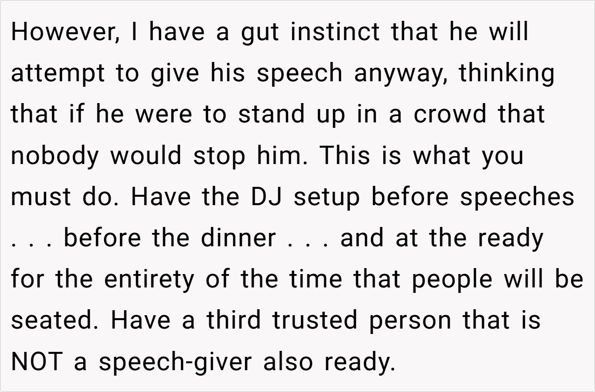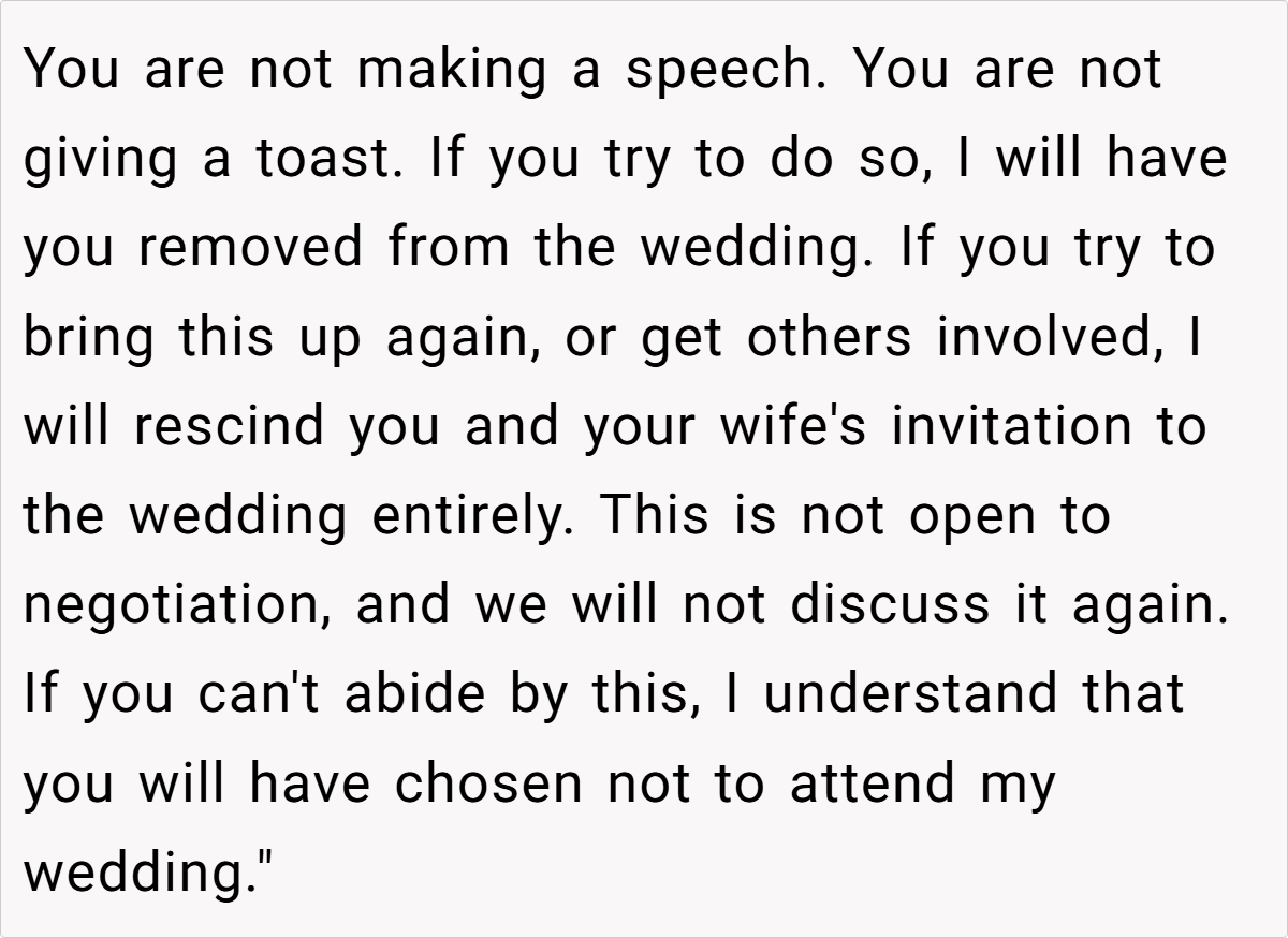 The financial and emotional scars of past losses sometimes make it challenging to separate personal history from the present. A family therapist explains, “Boundaries in family relationships are essential to maintain personal well-being,” emphasizing that a wedding should be about the couple’s union, not rehashing old grievances. In this light, the storyteller’s insistence on a speech-free approach isn’t merely a personal whim—it’s a measured response to protect her emotional well-being. It also underscores the need for respectful communication in sensitive family dynamics.