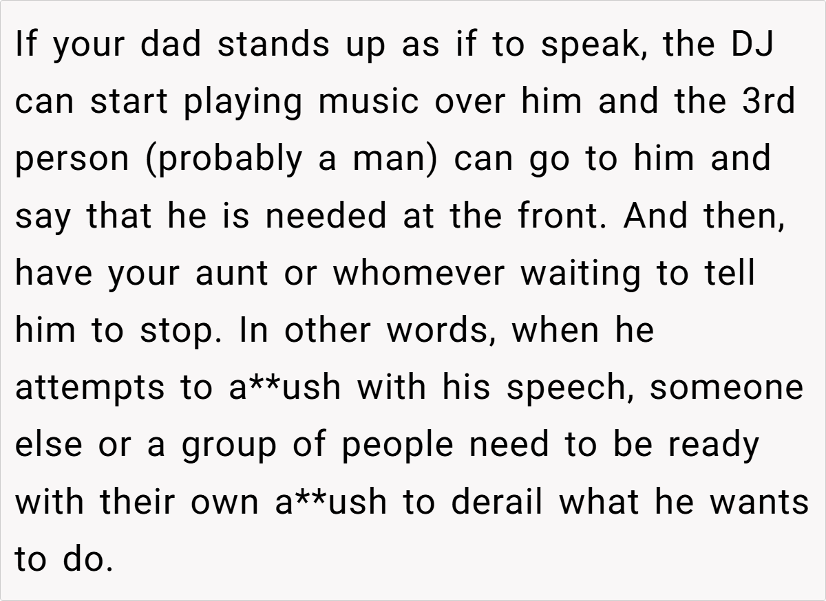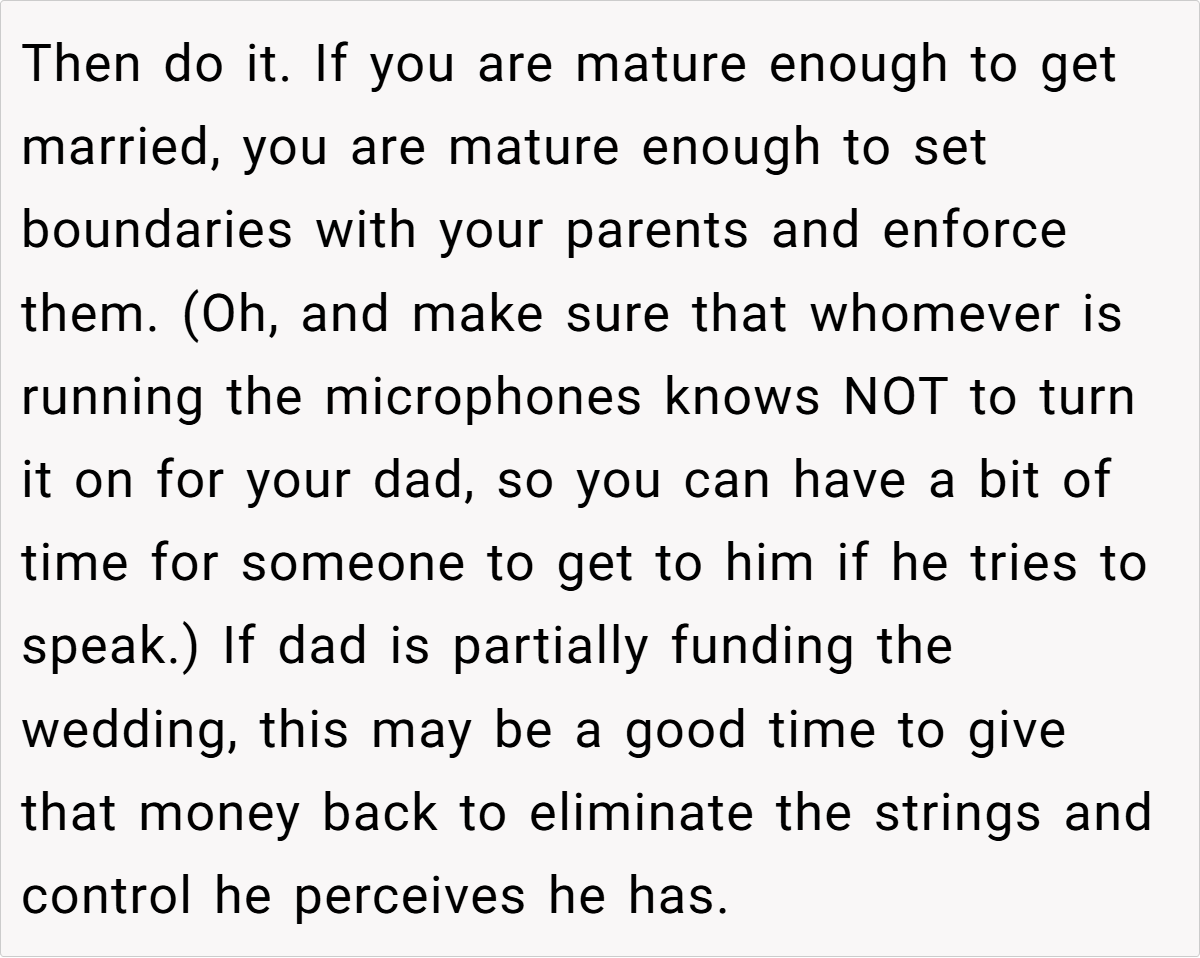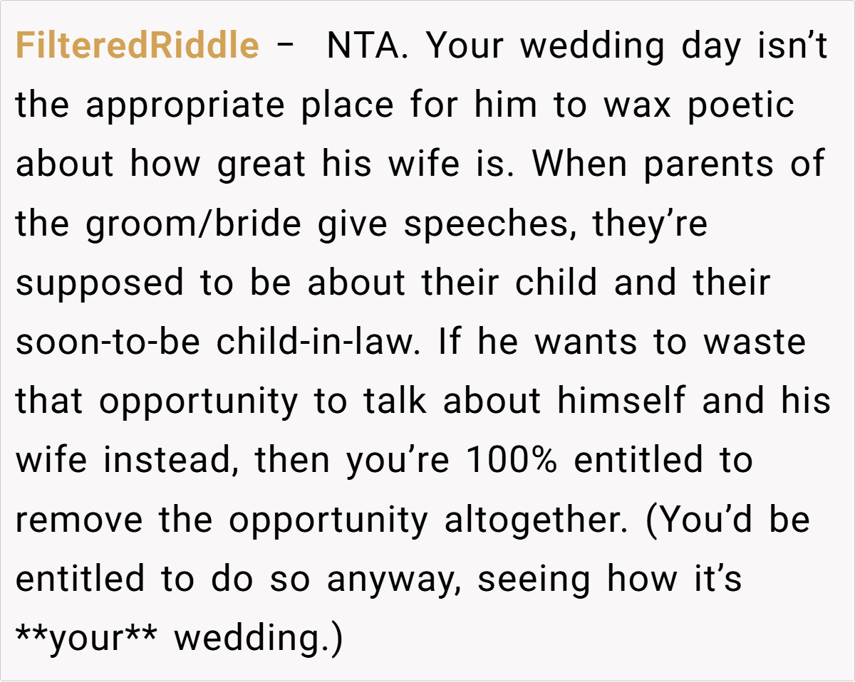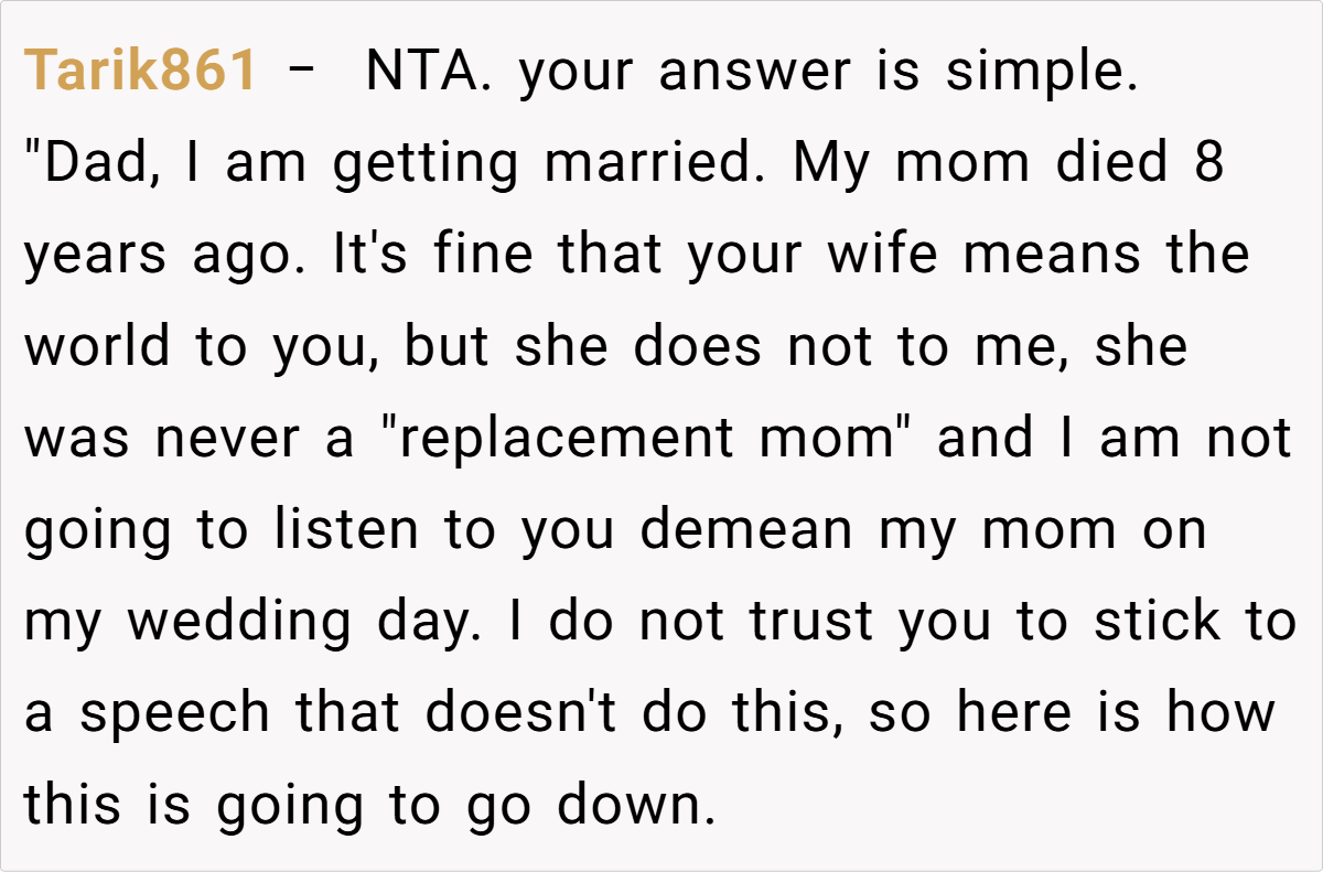 Most commenters agreed with OP’s decision, emphasizing that the wedding was about the couple and that OP’s father should not turn the day into a celebration of himself or his wife. Many felt that the father’s speech, which focused on praising the woman who replaced OP’s mother, was inappropriate and disrespectful to OP’s past. Members also suggested that OP should set clear boundaries with her father, perhaps by asking the moderator (DJ) to cut off the speech if her father tried to speak.