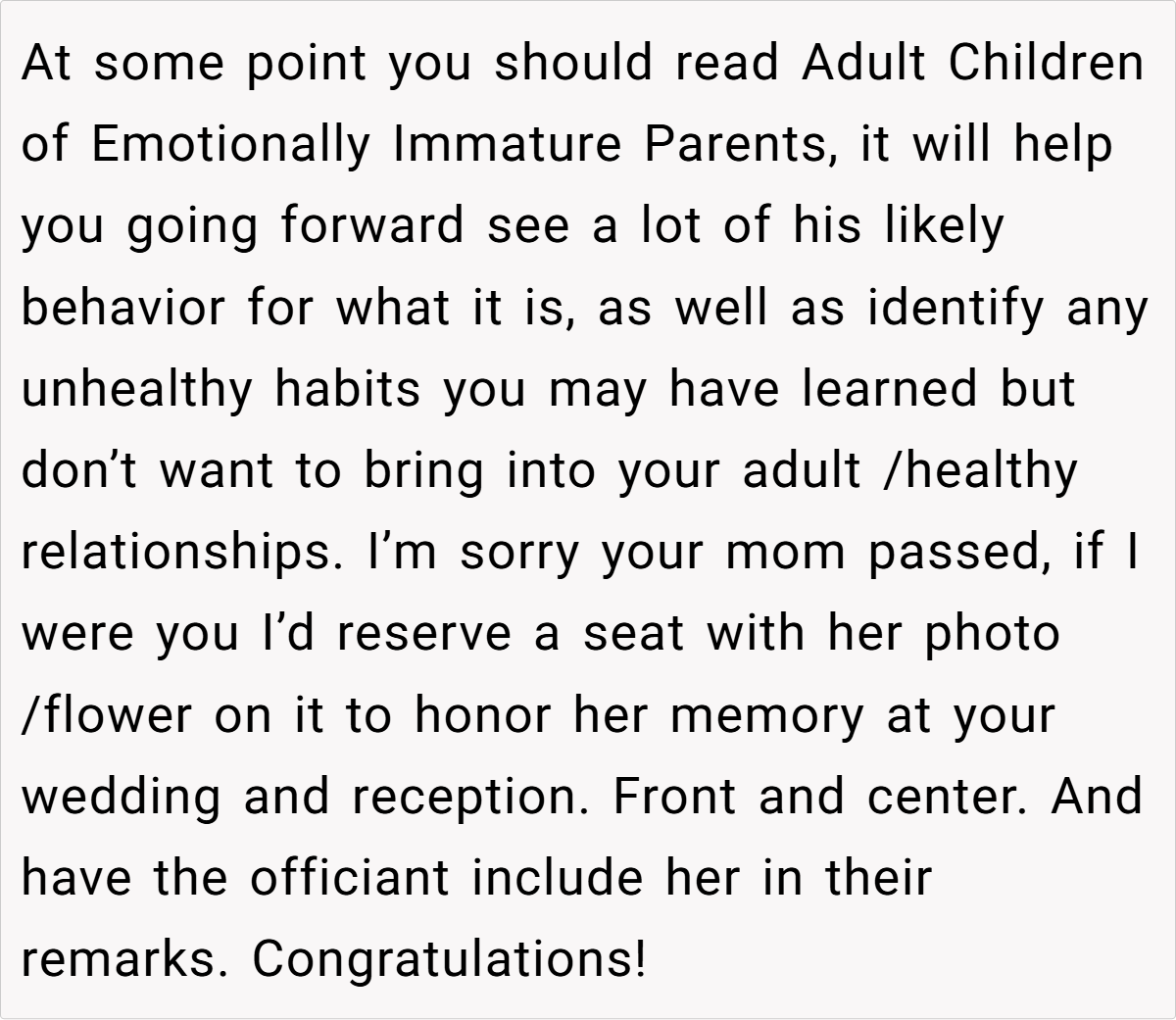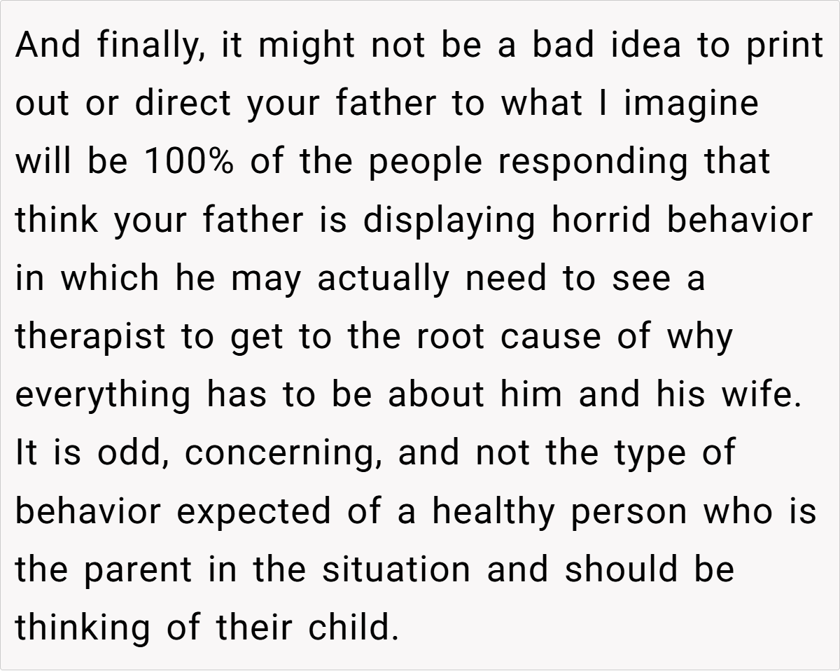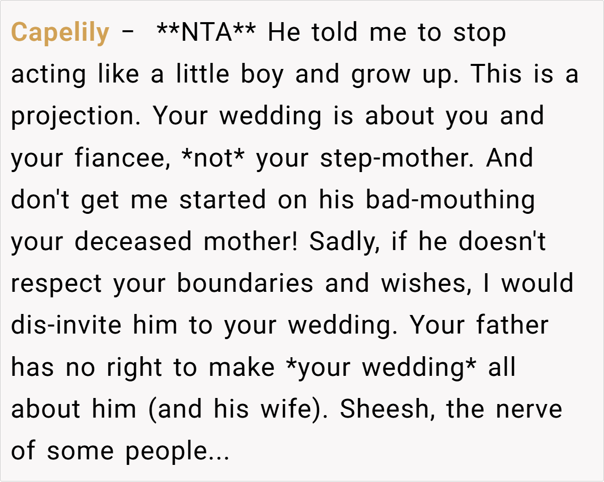Finally, the advice extends beyond just this scenario. For anyone facing similar family conflicts during major life events, transparent conversations and pre-planned boundaries can prevent a single moment from souring an otherwise joyous occasion. In this case, the storyteller’s clear expectations pave the way for a celebration that remains focused on love and new beginnings, rather than being a battleground for old issues.