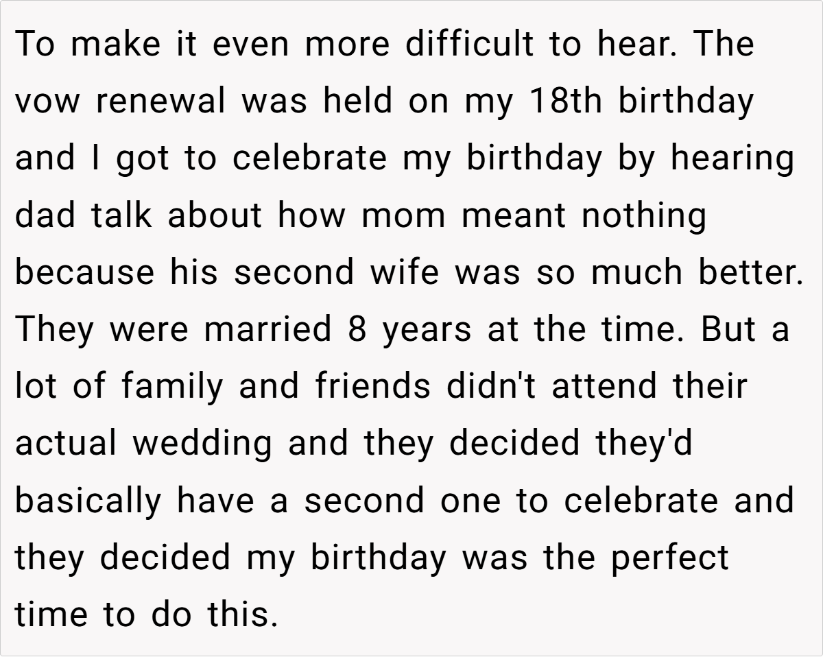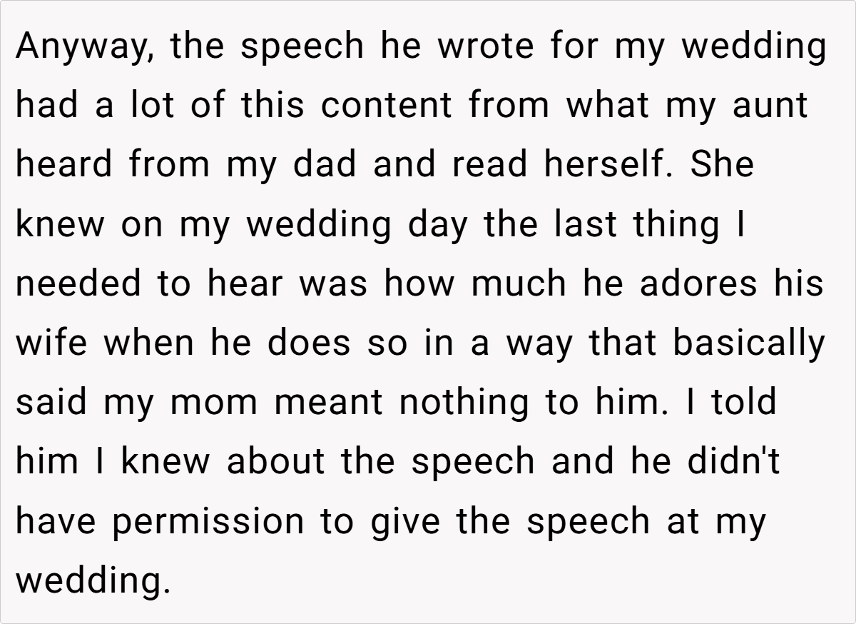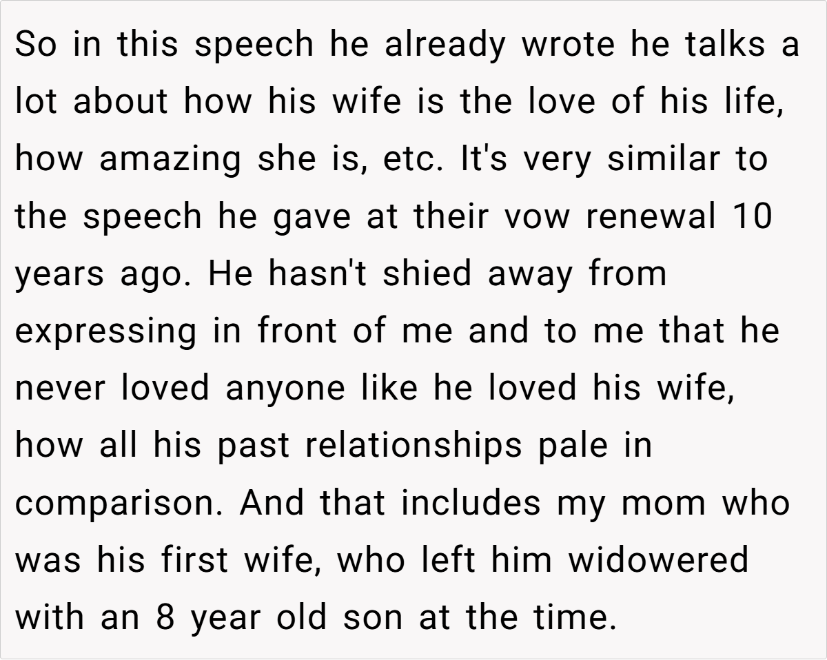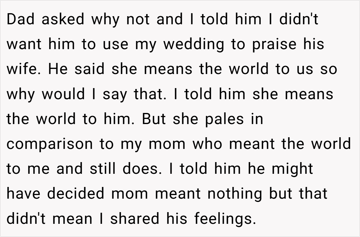 Letting family members speak at weddings is often seen as a cherished tradition. However, when those speeches reopen painful chapters or disrupt the couple’s vision, boundaries become essential. In this case, the storyteller is grappling with conflicting loyalties and lingering emotional wounds. The father’s planned speech, heavily laced with adoration for his current wife and dismissive of his late first wife, risks overshadowing the couple’s celebration. This highlights a broader issue of unresolved grief and the dangers of projecting personal narratives onto a day meant to honor new beginnings.