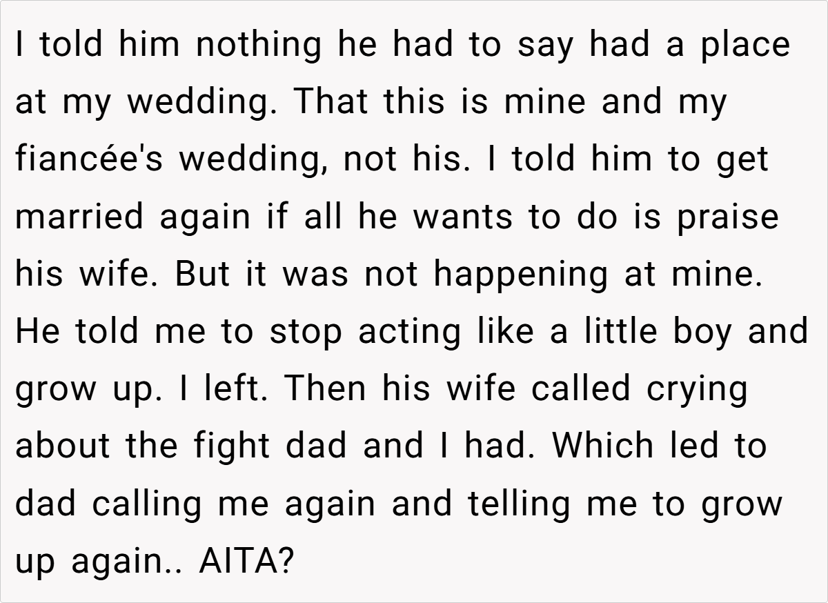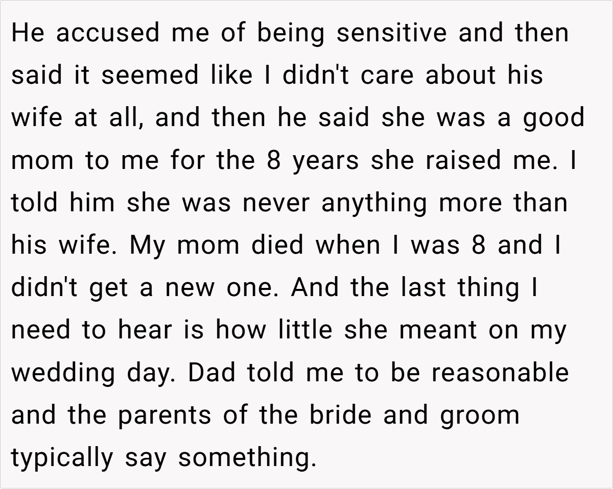 In the midst of planning a once-in-a-lifetime celebration, wedding stress can sometimes come from unexpected corners—especially family drama. Imagine preparing for the happiest day of your life only to face a looming conflict over a speech that digs too deep into past wounds. Our storyteller, in her twenties and excitedly anticipating her big day, found herself entangled in a bitter tug-of-war with her father. His impromptu decision to recite a speech that glorified his current wife—and downplayed the memory of her late mother—became a flashpoint in an already sensitive situation.
