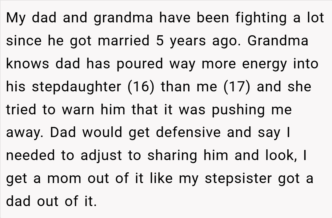 Family dynamics can sometimes feel like an intricate dance where everyone is forced to move to different tunes. In this story, a 17-year-old finds herself at the center of a long-standing feud between her dad and her grandma over unequal treatment. Since her father’s remarriage five years ago, tensions have escalated, fueled by perceptions of favoritism toward his 16-year-old stepdaughter.