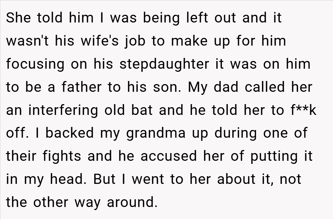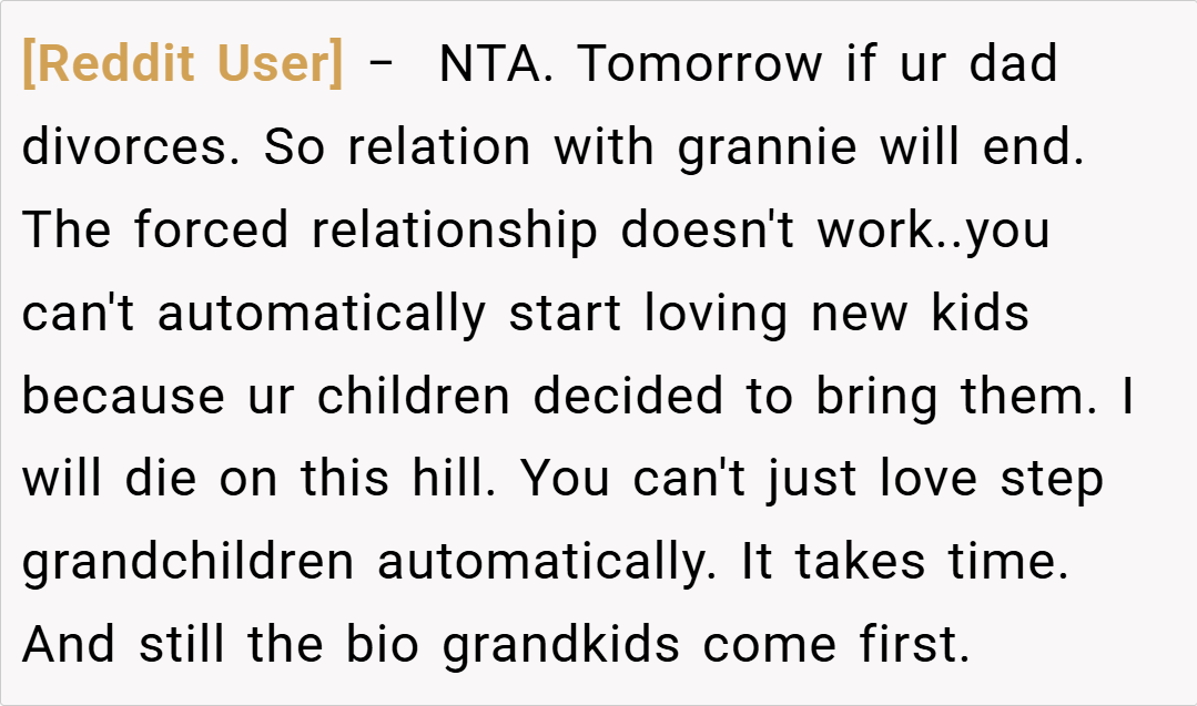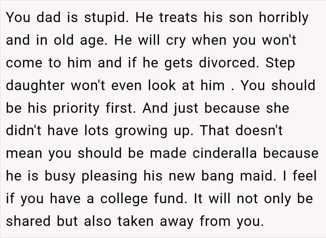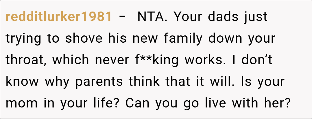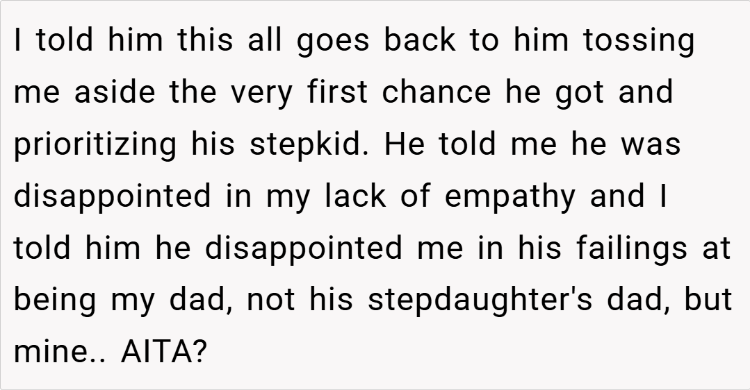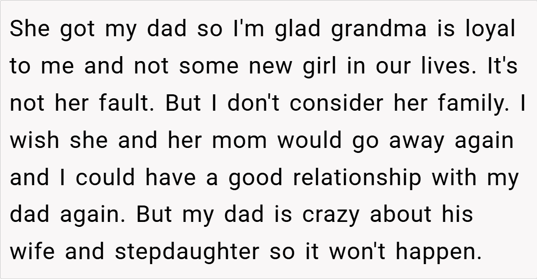Many redditors sympathize with the OP, asserting that her feelings are completely valid. A common sentiment is that no one should be forced to “share” a parent if it means feeling perpetually sidelined. Several commenters applauded her for standing up against what they see as blatant favoritism, while others pointed out that blended families are messy, but that doesn’t excuse unequal treatment.