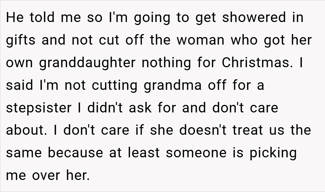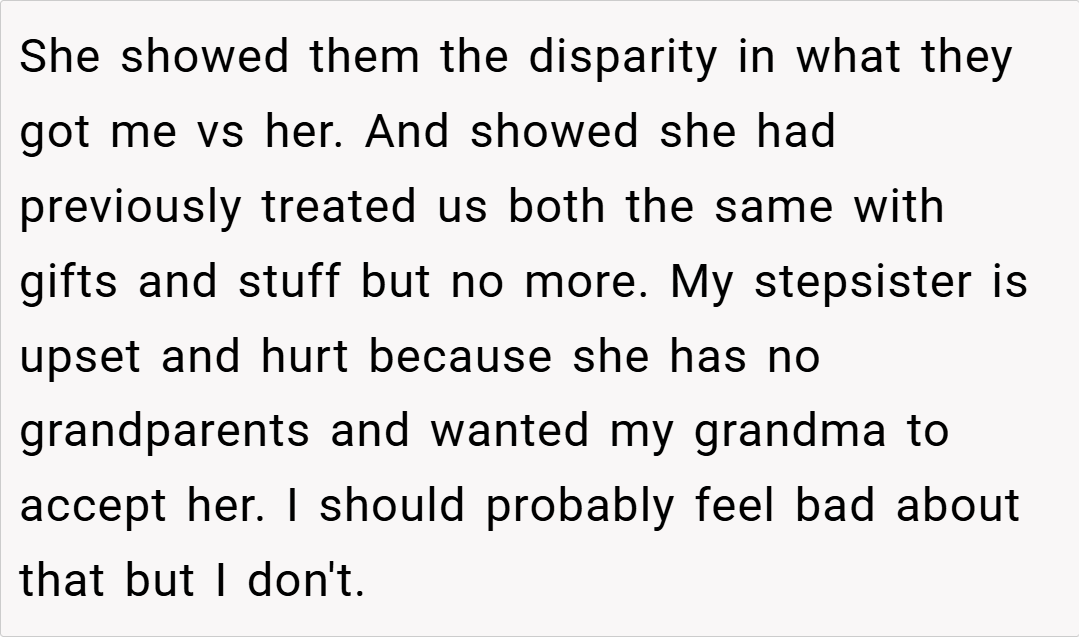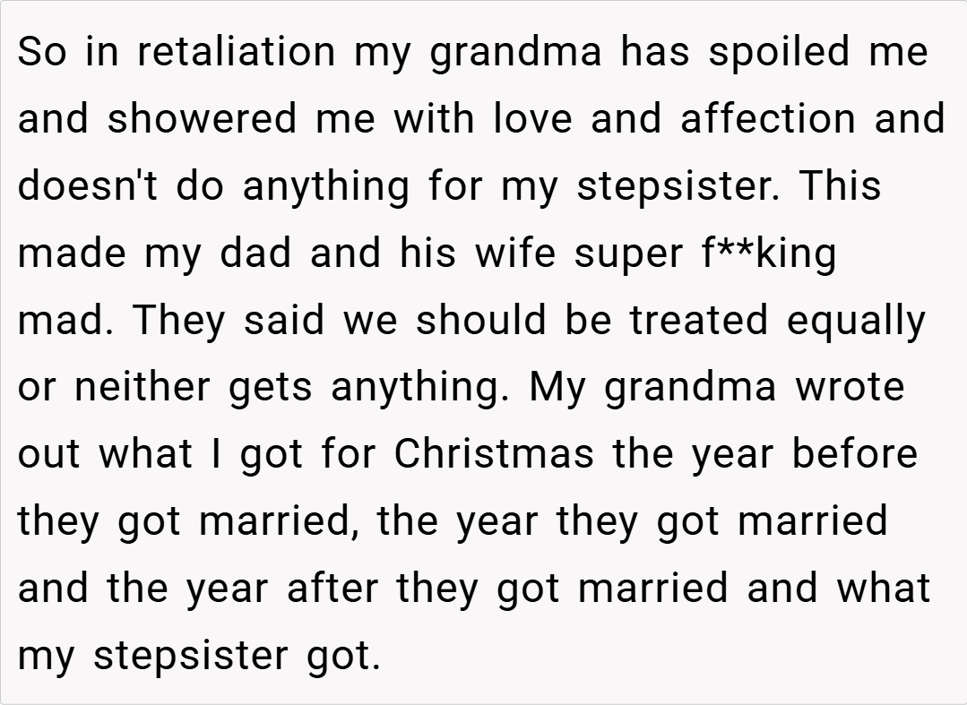 The OP’s grandma, once a beacon of balance, has increasingly shown her love and generosity toward the stepdaughter at the expense of the OP, leading to bitter family disputes. Frustrated and feeling betrayed, the OP stands her ground by refusing to cut ties with her grandma, arguing that even if her step-sister isn’t treated equally, at least someone in the family values her.