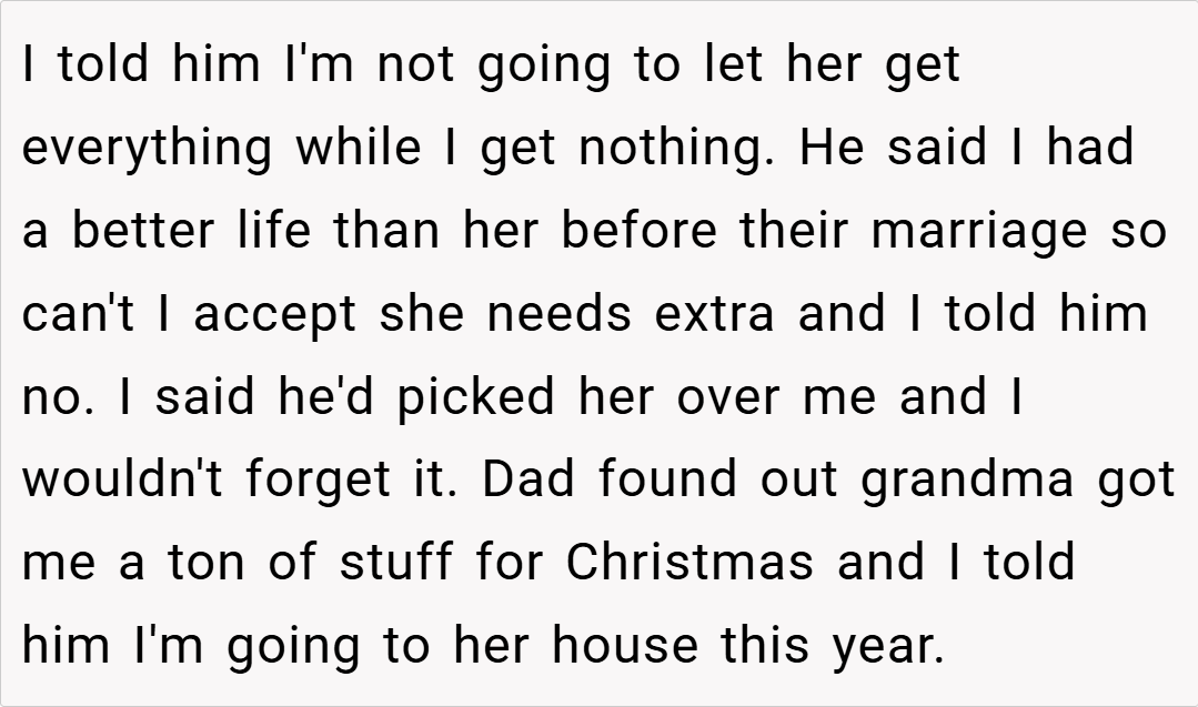 In the OP’s situation, the imbalance of affection has not only created division but has also forced her to choose between her father’s new family and the one that has always shown her unconditional love. The disparity in treatment—evidenced by detailed lists of Christmas gifts from different time periods—serves as a tangible reminder of where her value lies in her dad’s eyes.