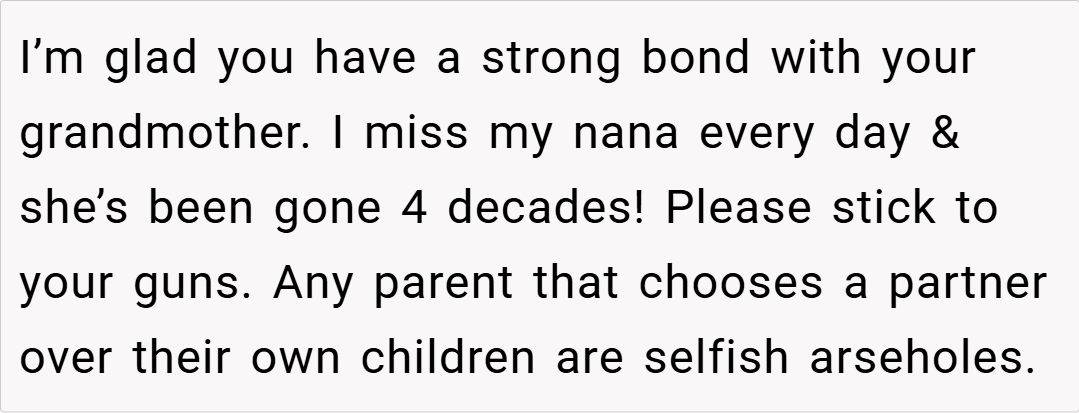 Dr. Gottman’s research suggests that when children perceive favoritism, it can disrupt the family’s emotional equilibrium and foster long-term conflict. The OP’s refusal to cut off her grandma is a protective response, safeguarding her sense of self-worth. This decision, while painful, illustrates the importance of setting boundaries in the face of perceived injustice. It’s a call to acknowledge that family love should be inclusive and fair, and that every child deserves to feel valued.