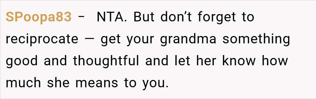 There’s also a humorous undercurrent where users joke about the absurdity of keeping score on Christmas presents. Overall, the consensus leans toward supporting her decision to hold onto the love of her grandma rather than succumb to the pressure for forced family unity.