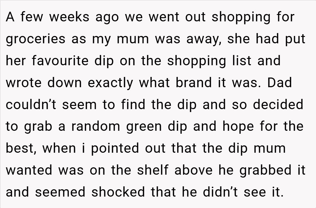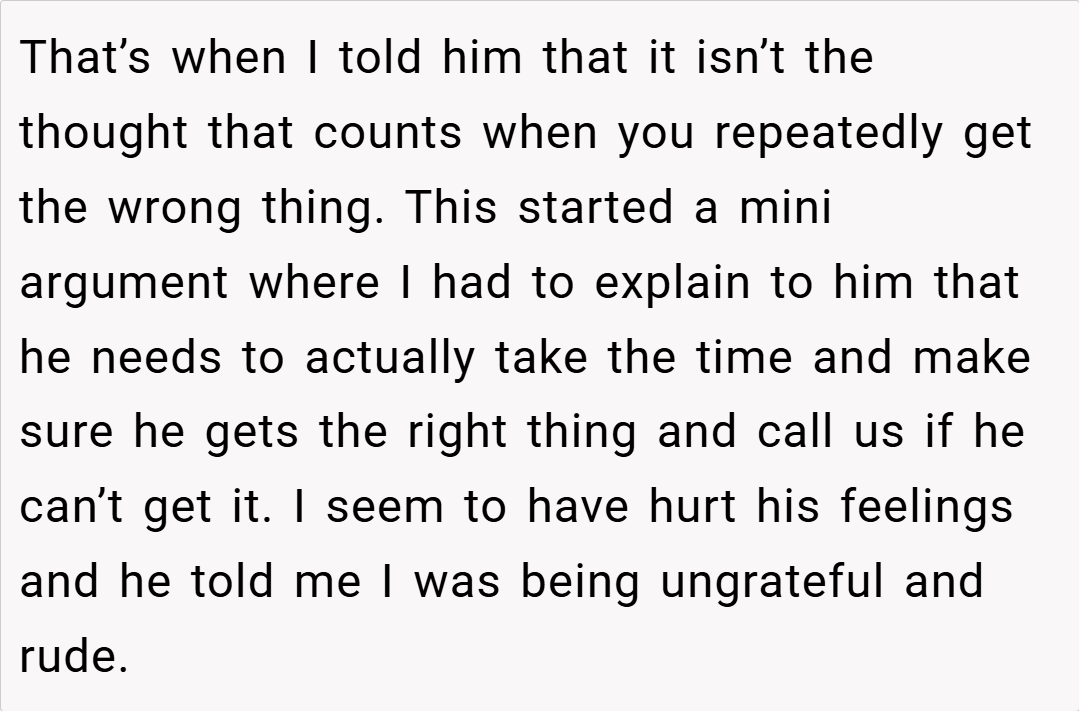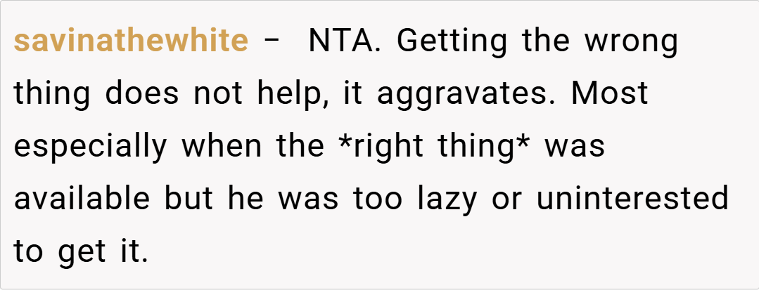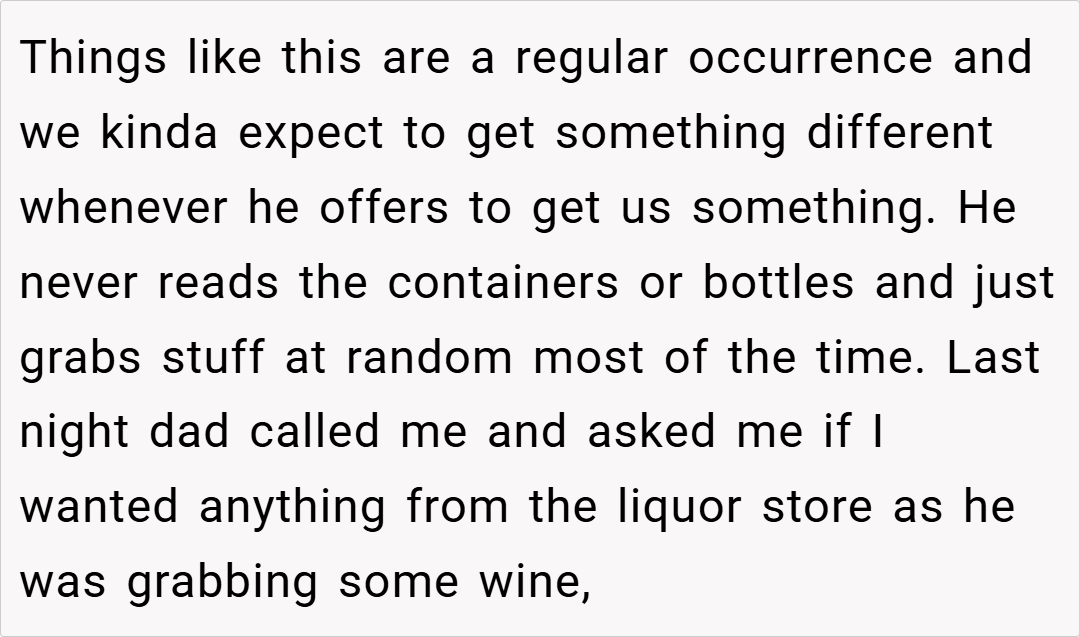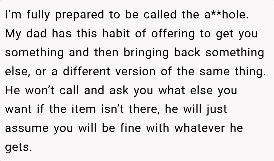 Let’s get real—offering to grab something is sweet, like a hug in errand form, but delivering a curveball every time? That’s less “thoughtful” and more “thoughtless autopilot.” Our Redditor’s dad isn’t malicious—he’s just coasting, picking whatever’s closest instead of hunting for the win. It’s the difference between tossing a lifeline and chucking a pool floatie that’s already popped.