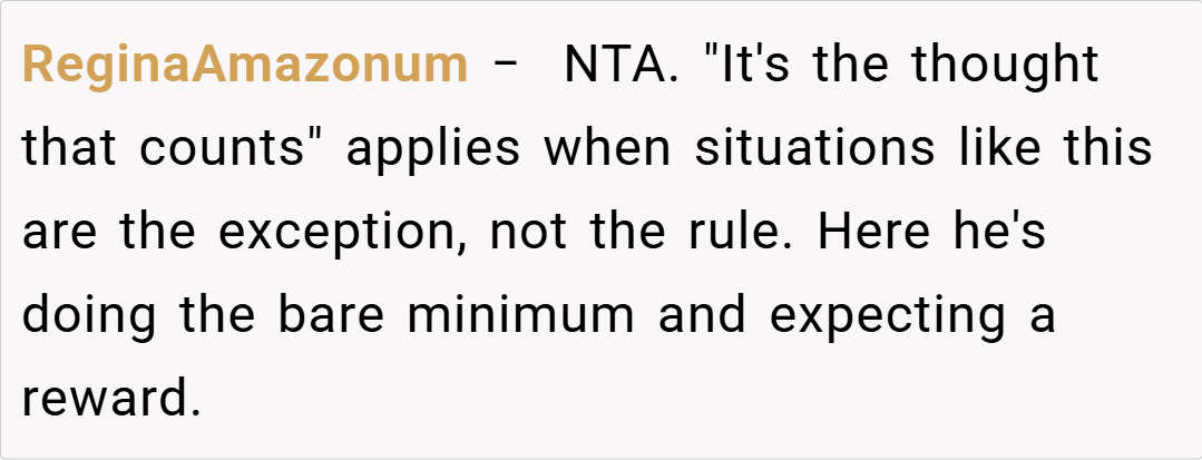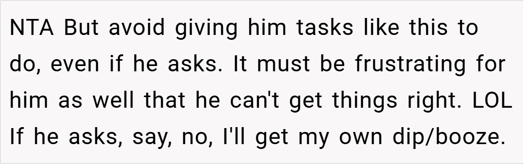 The Reddit posse didn’t mince words, and it’s a hoot:  “Weaponized incompetence!” one cried, while another zinged, “Pick up the wrong thing for him and say, ‘Thought counts, right?’” The NTA—Not The Asshole—verdict’s unanimous, with a side of “Dad needs to think harder.” These quips are sharp enough to slice through the green dip debate, but do they hold up off-screen? You tell us.