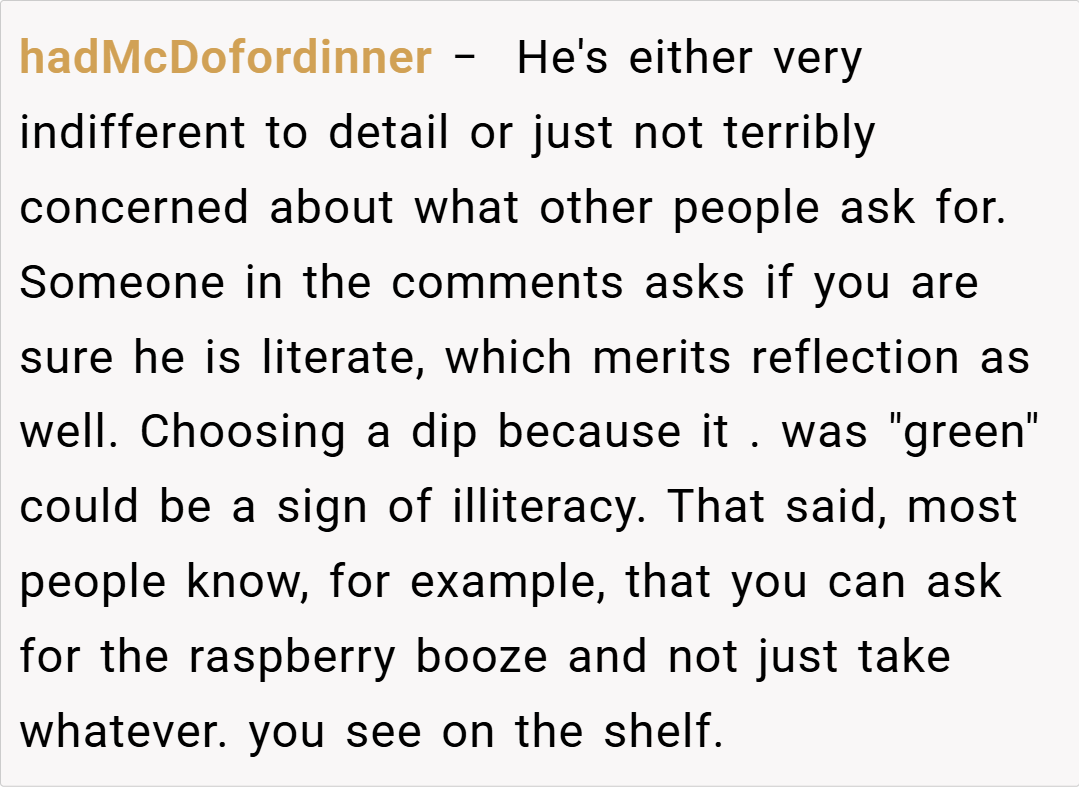 The bigger picture? Communication’s the casualty here. Dad could text, “No raspberry—cool with mango?” and boom, problem solved. Instead, he’s rolling the dice and getting miffed when they don’t land. Advice, Redditor? Next time, sidestep the middleman—hit the store yourself or tag a sibling with sharper shelf skills. If Dad pushes, suggest a vision check (half-joking, half-serious—those dips don’t hide that well!).