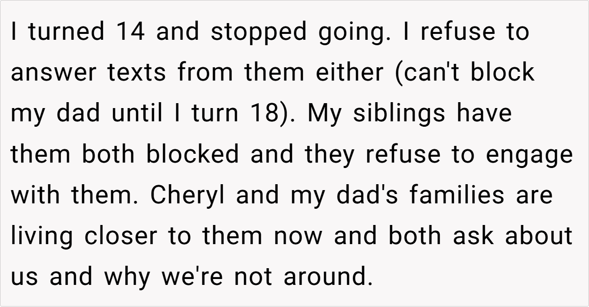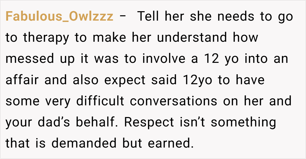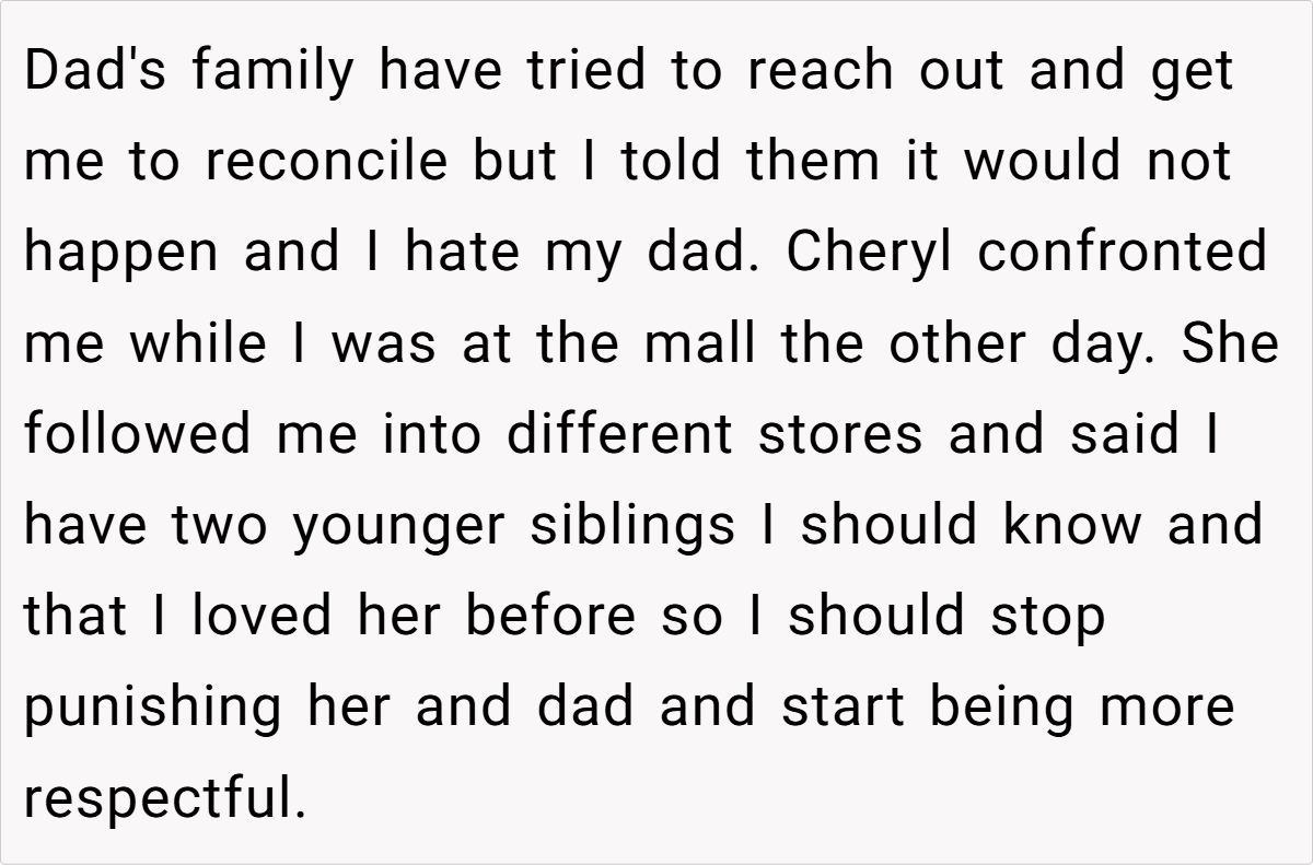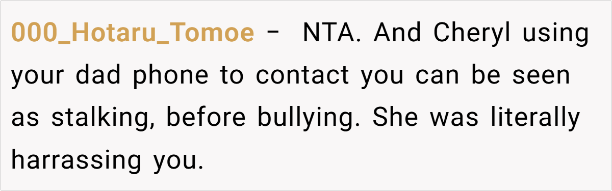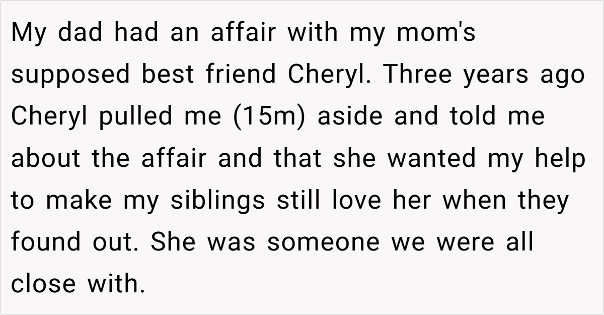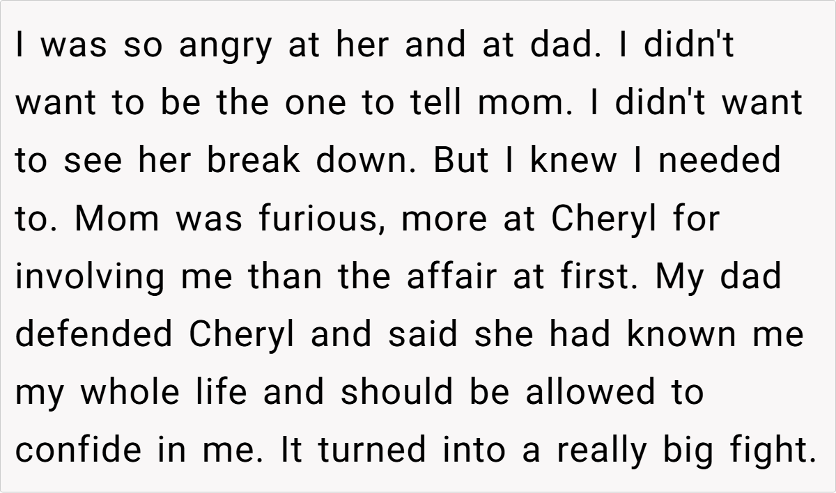 Many redditors agree that you were entirely justified in your response. Commenters condemned Cheryl’s manipulative tactics and the reprehensible decision to involve you in adult affairs. They echoed that no child should ever be put in the position of managing family secrets or mediating conflict, and praised your stand against such exploitation. The consensus is that your reaction, though strong, is a necessary declaration of personal boundaries against inappropriate behavior.