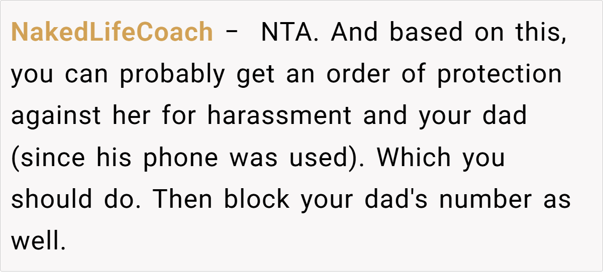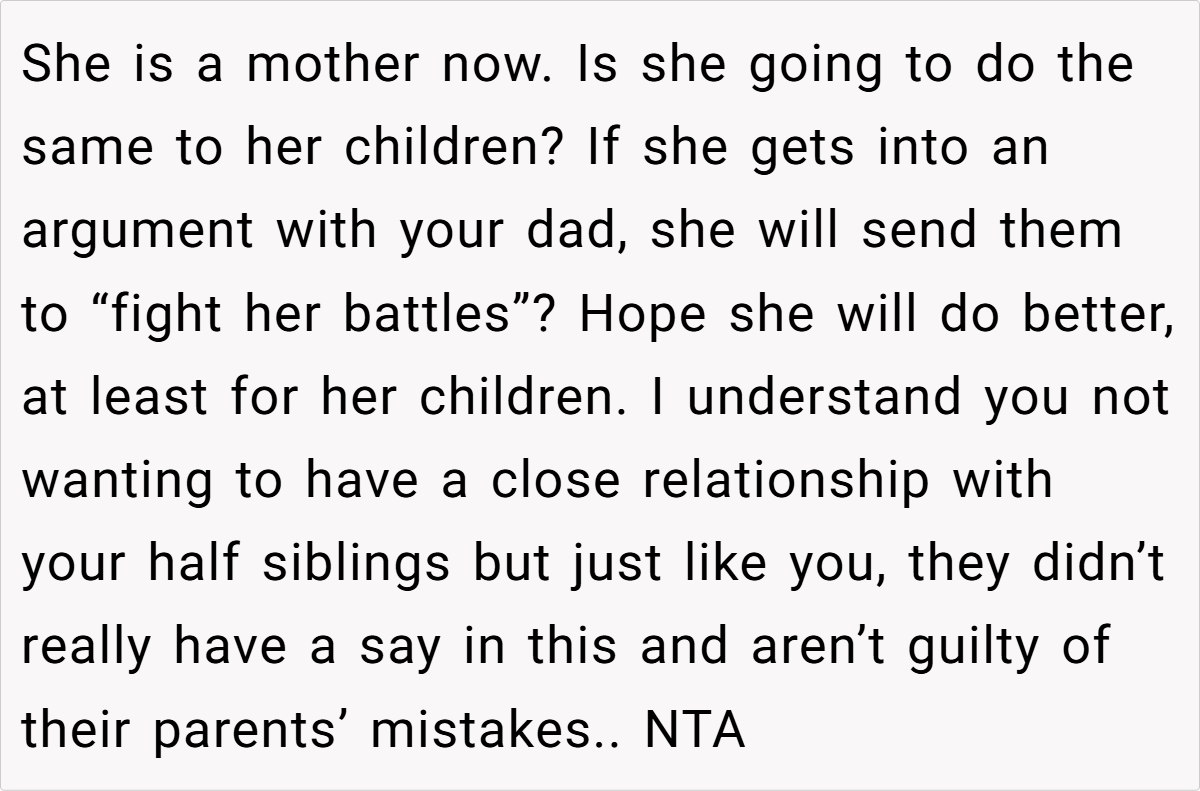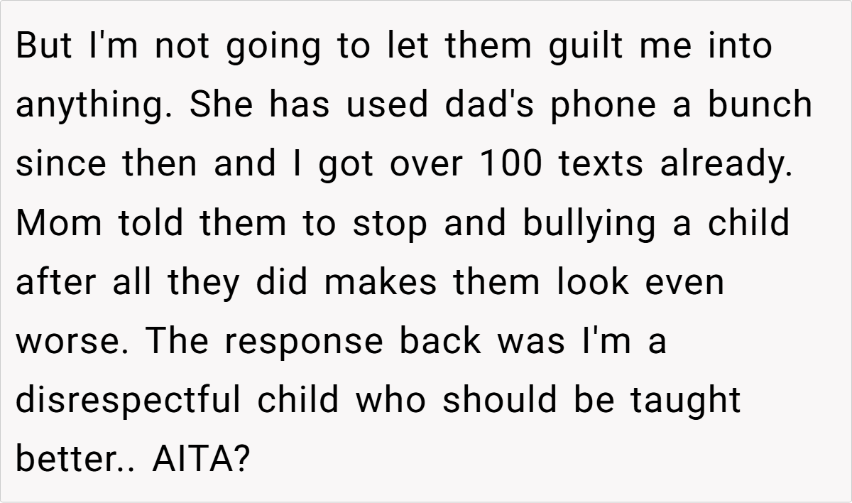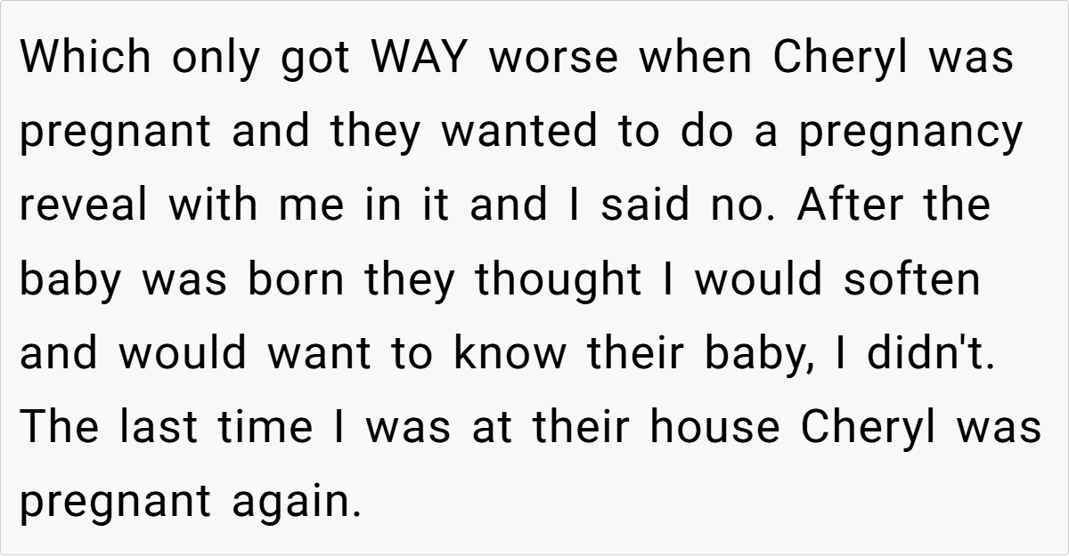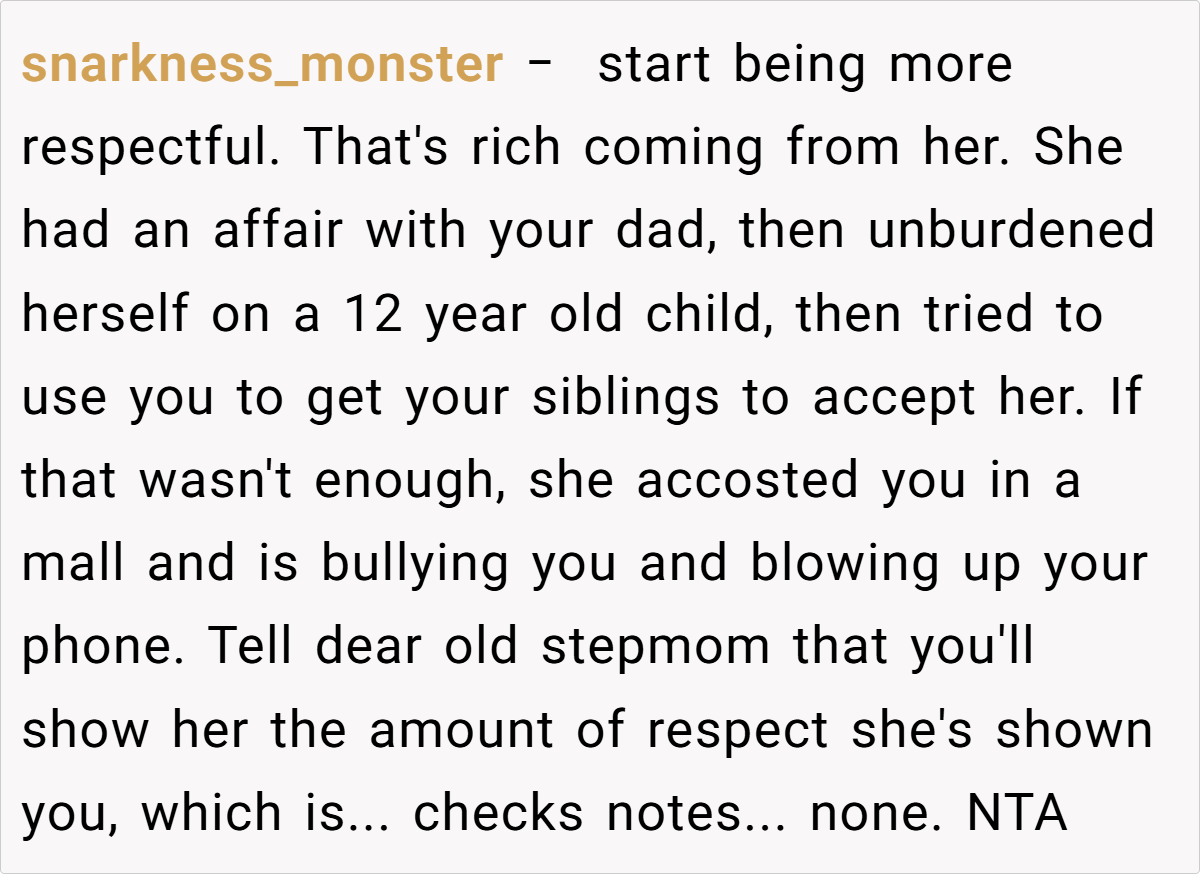 Many redditors agree that you were entirely justified in your response. Commenters condemned Cheryl’s manipulative tactics and the reprehensible decision to involve you in adult affairs. They echoed that no child should ever be put in the position of managing family secrets or mediating conflict, and praised your stand against such exploitation. The consensus is that your reaction, though strong, is a necessary declaration of personal boundaries against inappropriate behavior.