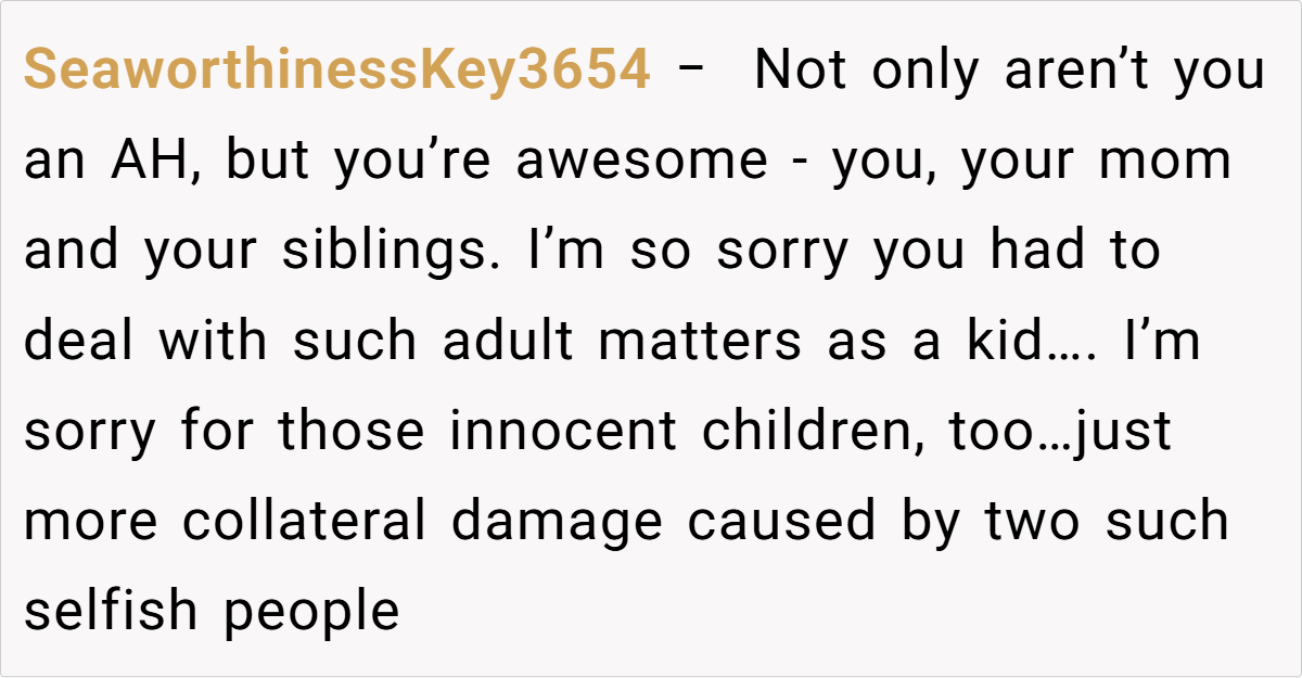 “It’s crucial for children to be shielded from the fallout of adult decisions,” Dr. Michaels emphasizes. “Your reaction, though harsh, is a protective response to an environment that continually violates a child’s right to a safe and nurturing space.” In sum, setting boundaries against such manipulation is not only justified but essential for preserving your mental health and future well-being.
