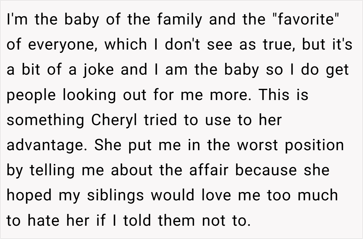 In this case, Cheryl’s decision to confide in you about the affair, hoping that your siblings would continue to favor her, is a textbook example of emotional manipulation. Such behavior not only places an unfair burden on a child but also risks distorting their understanding of trust and loyalty.