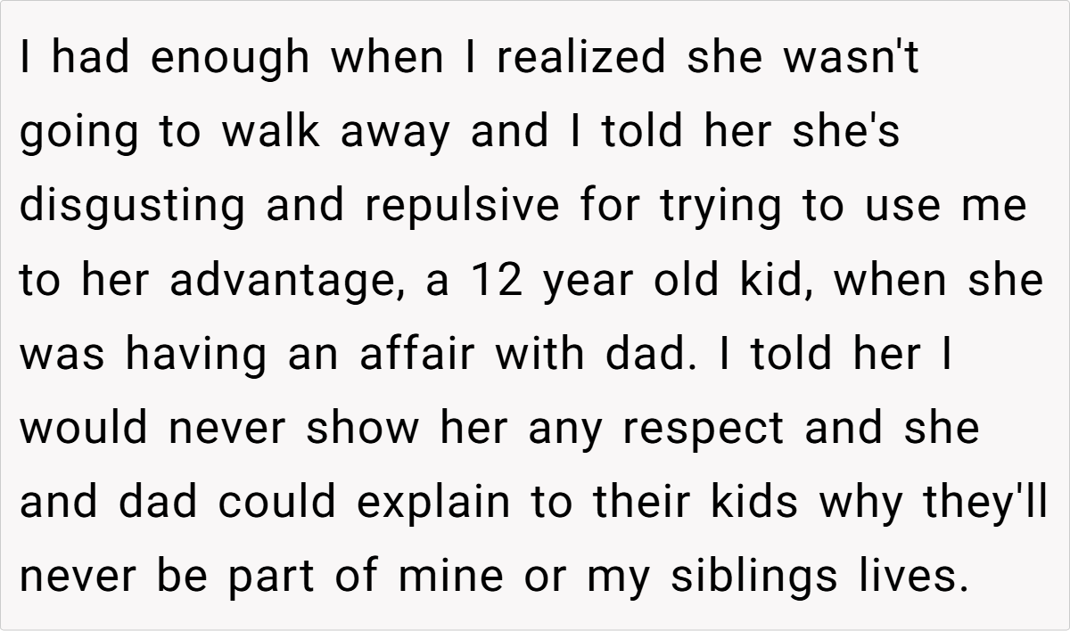 ‘AITA for telling my dad’s mistress and now wife that she’s disgusting and repulsive to try and use a kid to her advantage during her affair?’