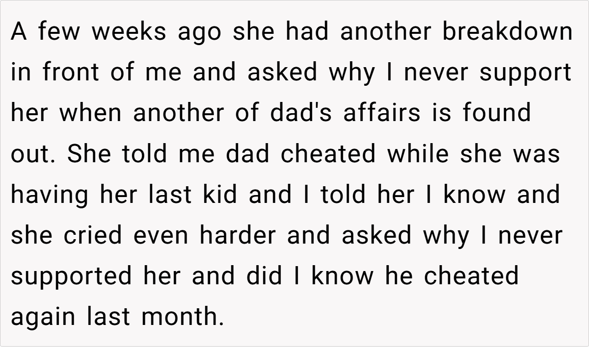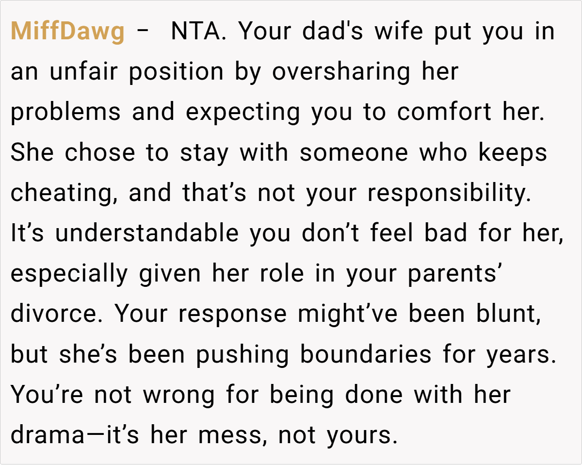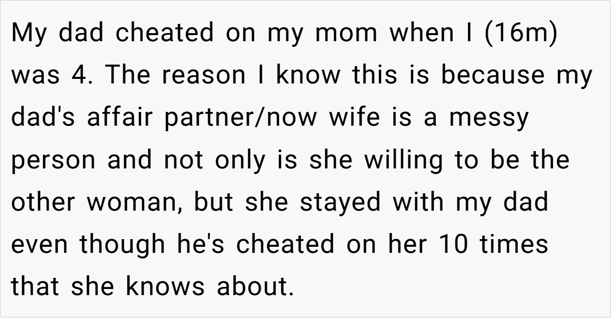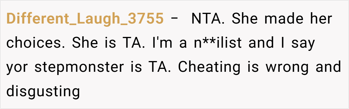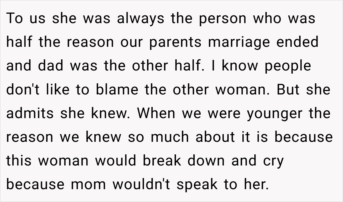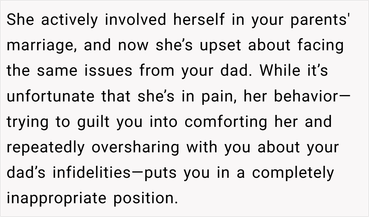 This story underscores the ripple effects of infidelity and the unrealistic expectation for children to absolve adults of guilt. While OP’s bluntness may seem harsh, it reflects years of unresolved anger and boundary violations.