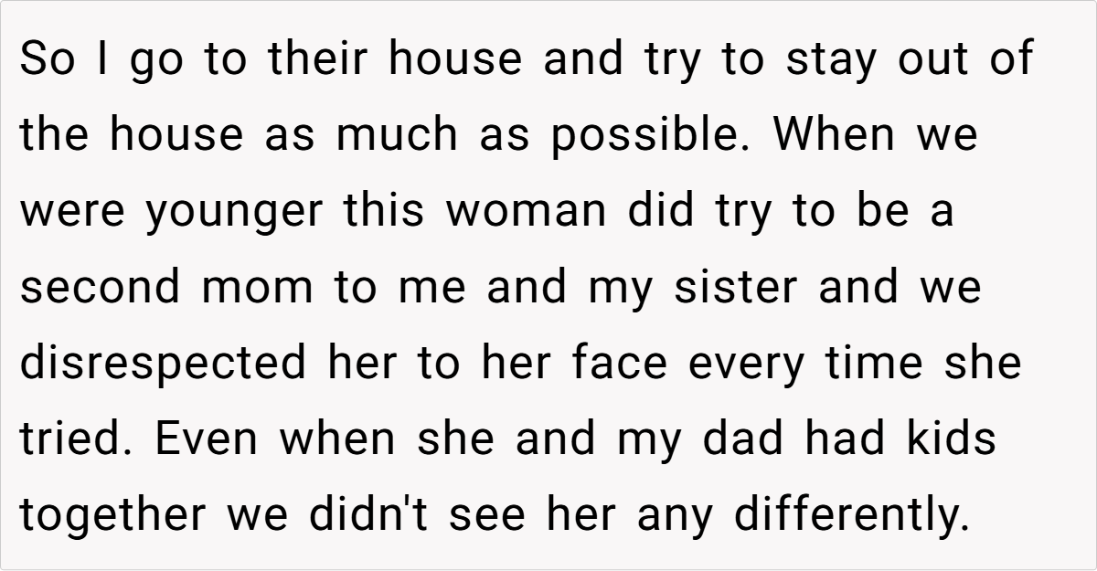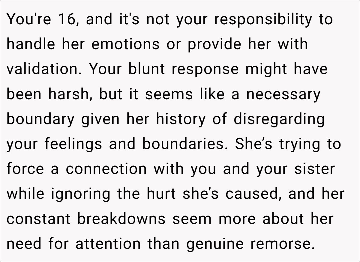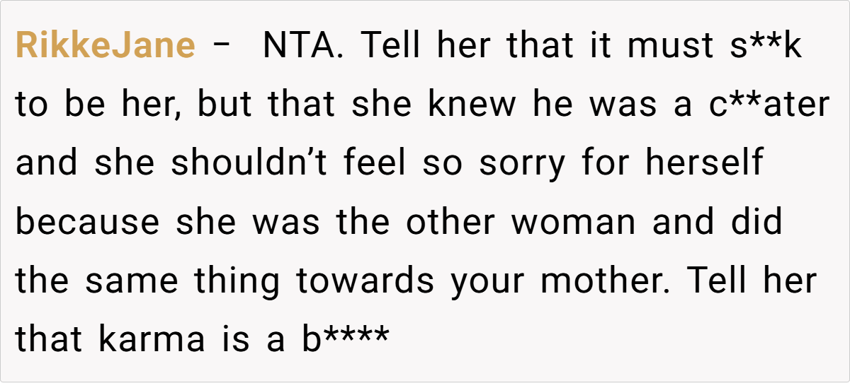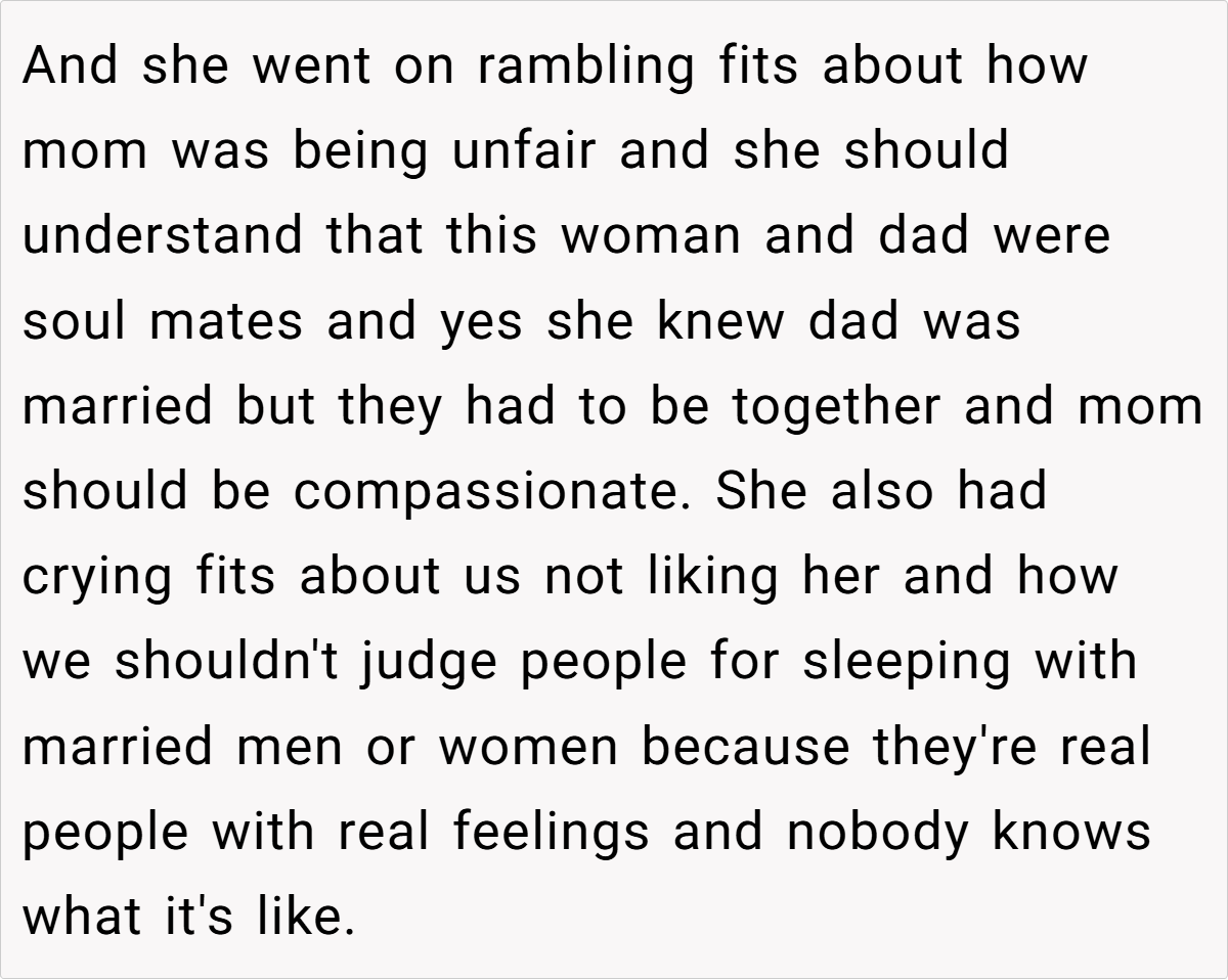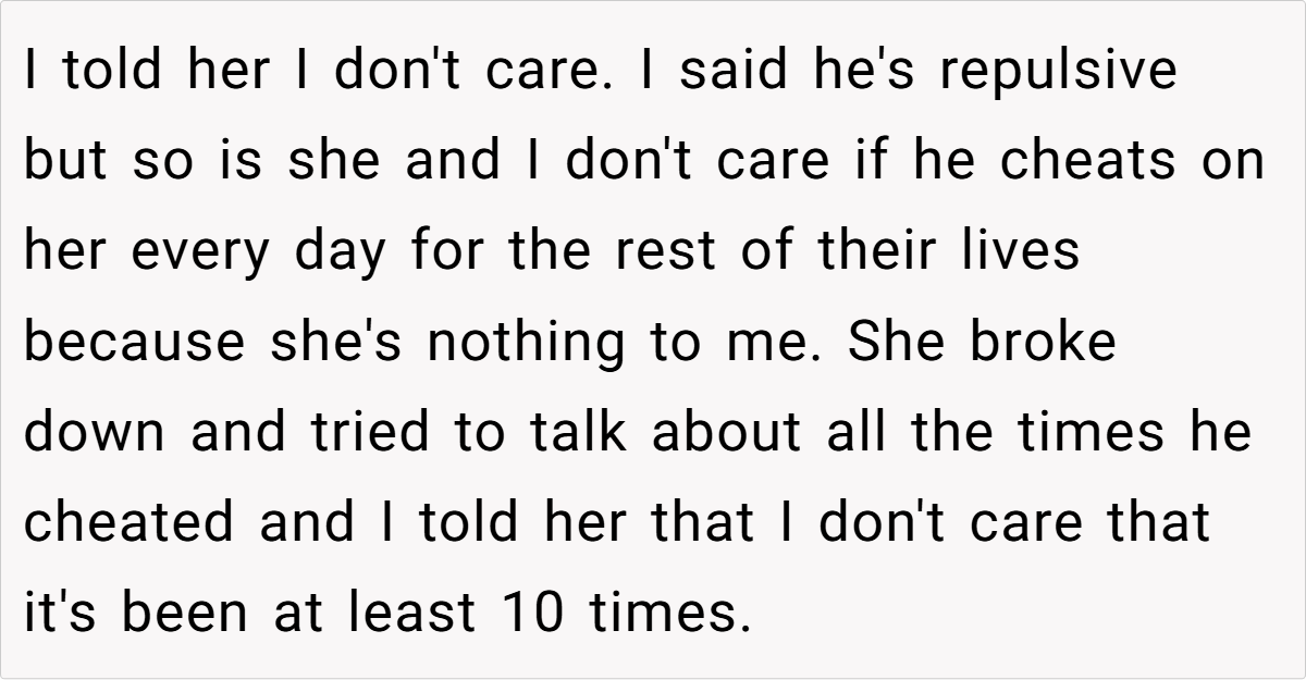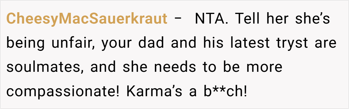 This story underscores the ripple effects of infidelity and the unrealistic expectation for children to absolve adults of guilt. While OP’s bluntness may seem harsh, it reflects years of unresolved anger and boundary violations.