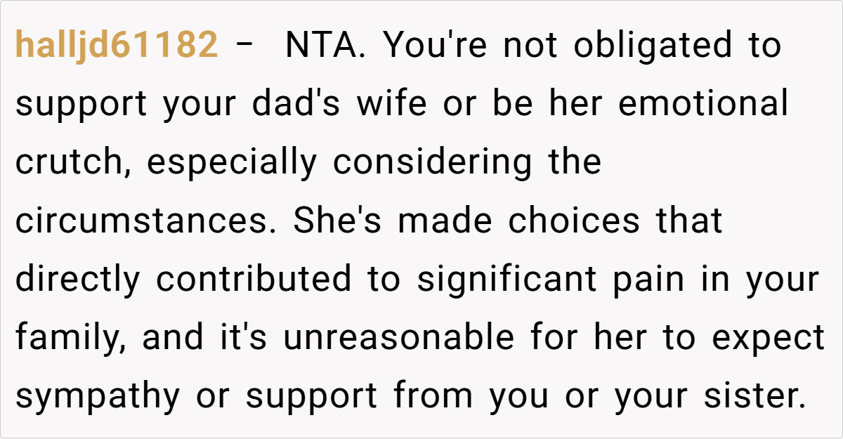 Final Take: Sympathy is earned, not owed. OP’s stepmother prioritized her relationship over OP’s family stability; expecting his support now ignores the harm she caused.