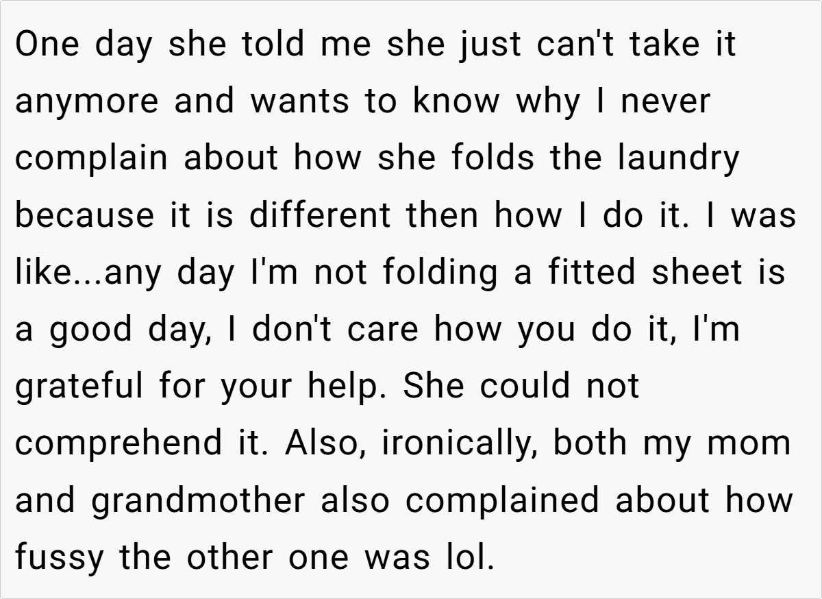 By addressing her own anxiety and recognizing the limits of her control, the new mother might eventually restore the balance in her relationships. Instead of viewing each minor infraction as a personal failure, embracing flexibility could not only alleviate her own stress but also rekindle the willingness of her family to help. The key lies in shifting from a mindset of “my way or no way” to one that values collaboration, understanding, and the occasional harmless mistake.