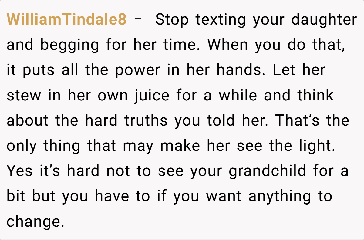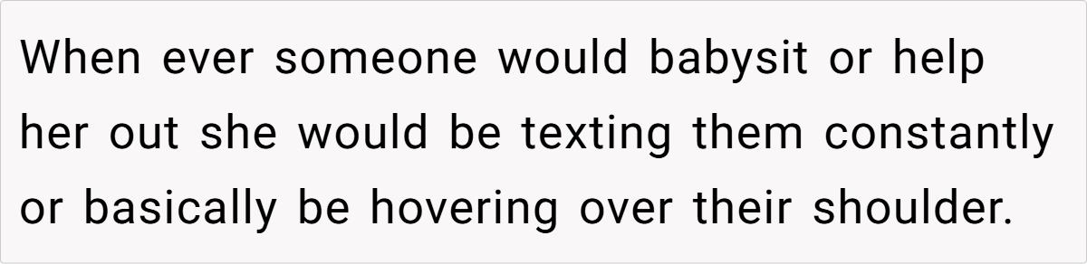 The tension peaked when her constant hovering and incessant texting over every minor detail pushed her family members to step back. Despite repeated attempts to set boundaries, the new mother’s inability to accept any deviation from her own standards has transformed well-meaning help into a source of conflict.
