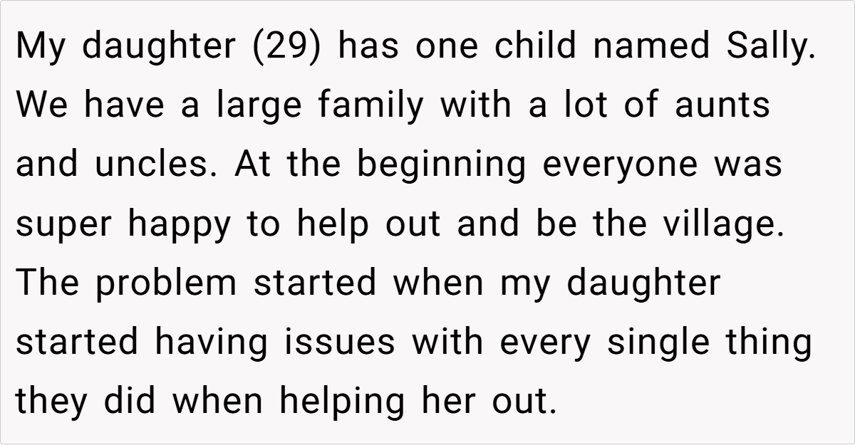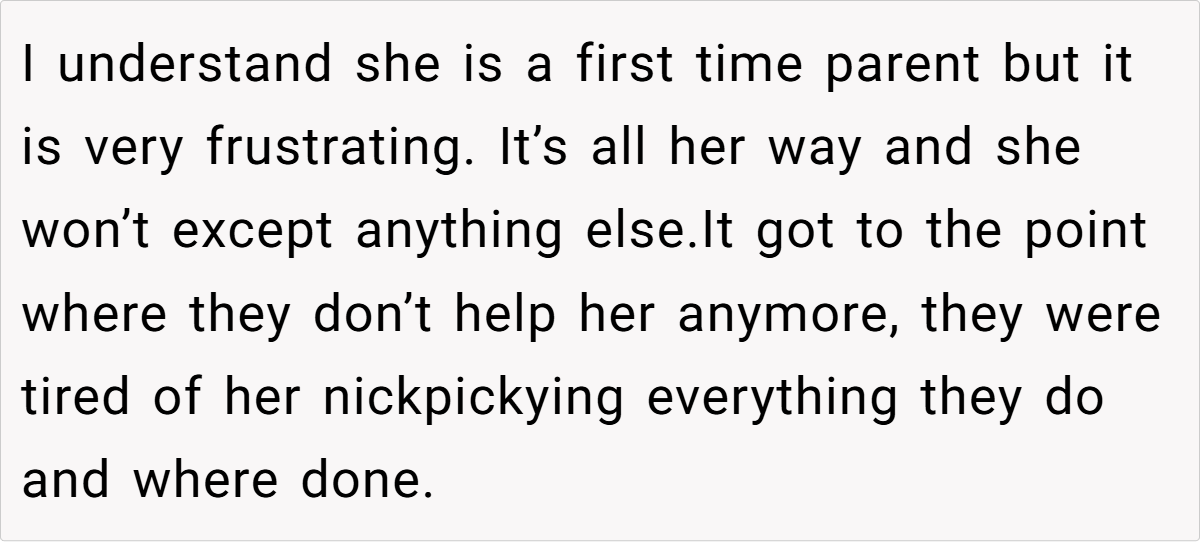 Overall, the Reddit community resonated with the view that the issue lies not with the helpers but with the overbearing behavior of the new mom. Commenters pointed out that if family members are offering help, they deserve gratitude, not relentless oversight. Many highlighted that the constant criticism was a significant factor in driving the “village” away. The consensus was clear: boundaries are essential, and when a parent’s need for control overshadows genuine support, the whole system breaks down.