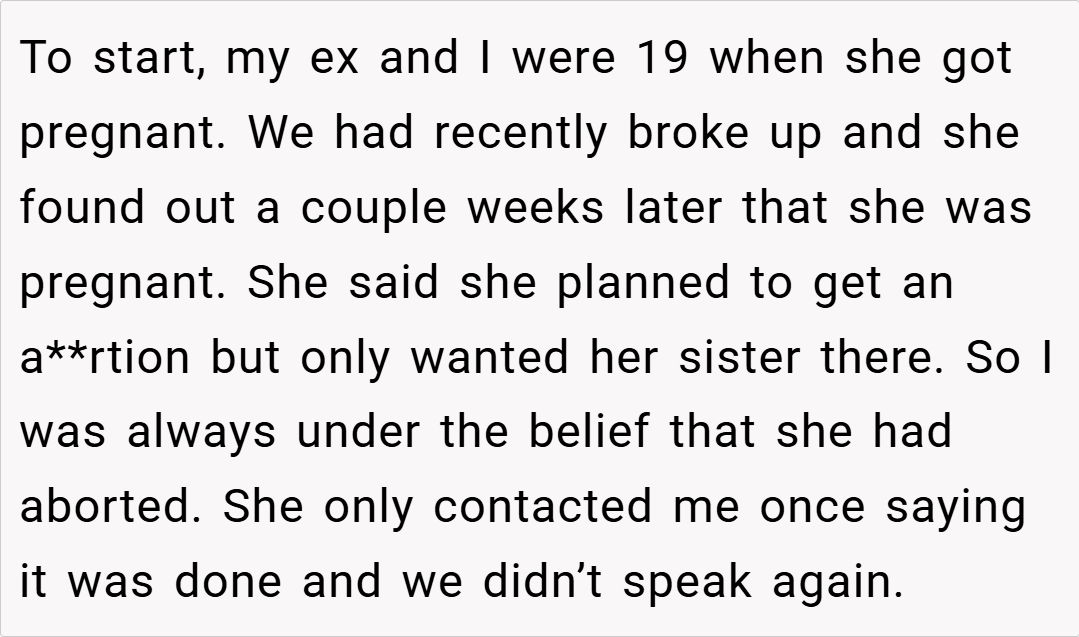 Family secrets have a way of surfacing at the most unexpected times, leaving us to wonder if honesty does more harm than good. I (24F) recently discovered that the narrative I believed about my past was a lie. When my ex, with whom I was involved at 19, got pregnant, I was led to believe that an abortion had taken place—because she didn’t want me involved, given our breakup.