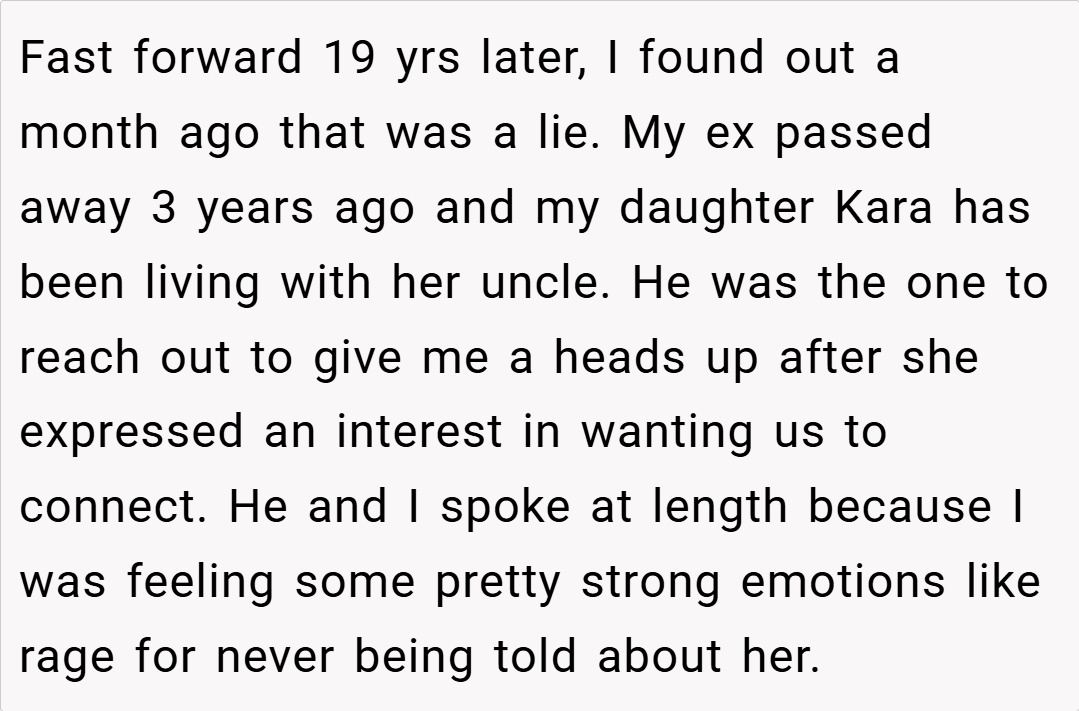 Fast forward 19 years, I learned from her brother, Rob, that I was deceived: my daughter Kara exists, and she’s been living with her uncle. While I’m thrilled to finally have a chance at building a relationship with her, revealing the truth about why I wasn’t there for her has sparked a family uproar.