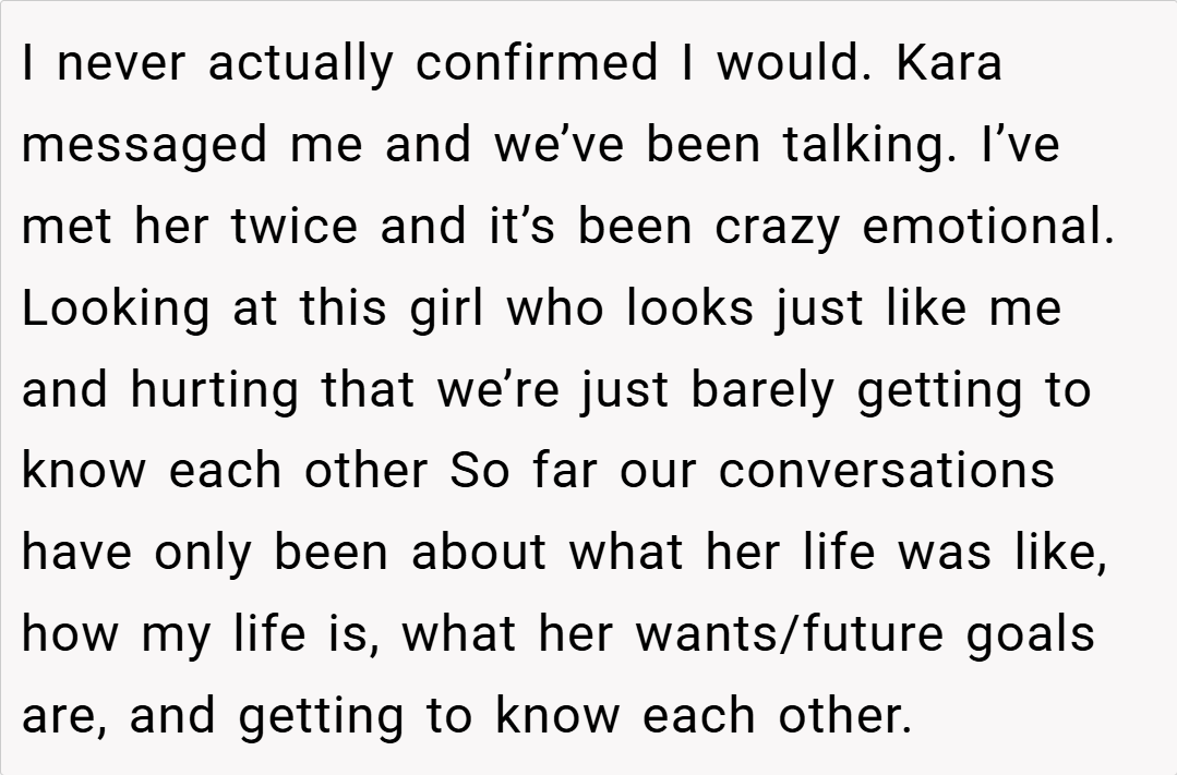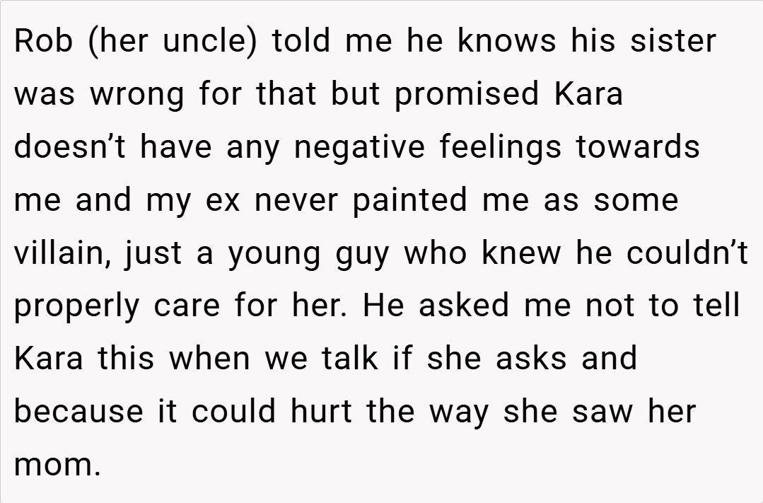 Ultimately, your decision to tell Kara the truth about why you weren’t in her life is deeply personal and laden with both vulnerability and a desire for genuine connection. While it’s clear that your revelation has upset your family and could potentially harm Kara’s idealized view of her late mother, it also opens the door for a real relationship based on honesty. This situation raises an important question: How do we balance the need for truth and authenticity with the responsibility to protect a child’s emotional well-being?