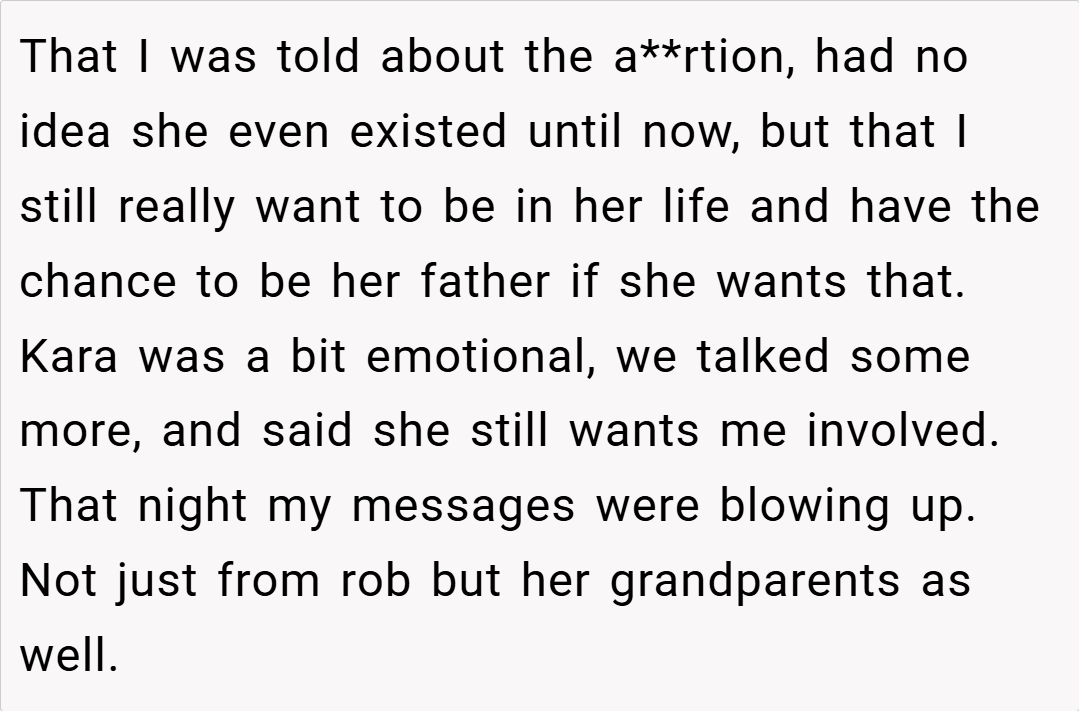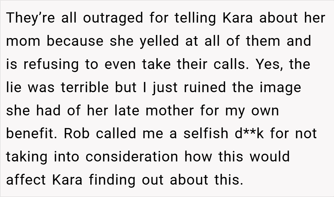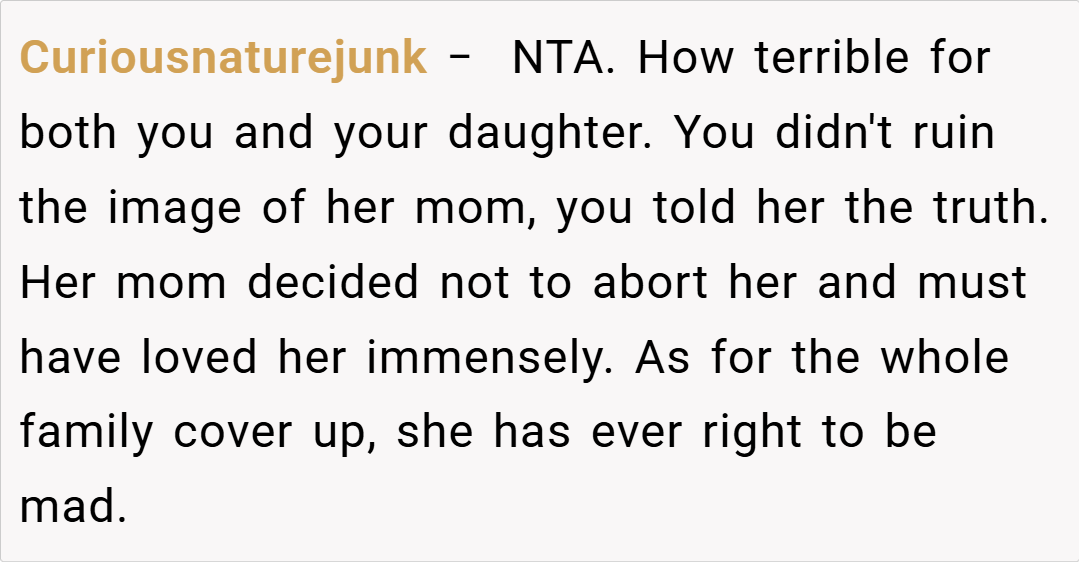 My grandparents and others are furious that I shared details about the so-called “abortion” with Kara, saying it tarnishes her image of her late mother. Now I’m left feeling torn between my commitment to honesty and the hurt it may have caused. Am I the asshole for telling Kara the truth about why I wasn’t in her life?